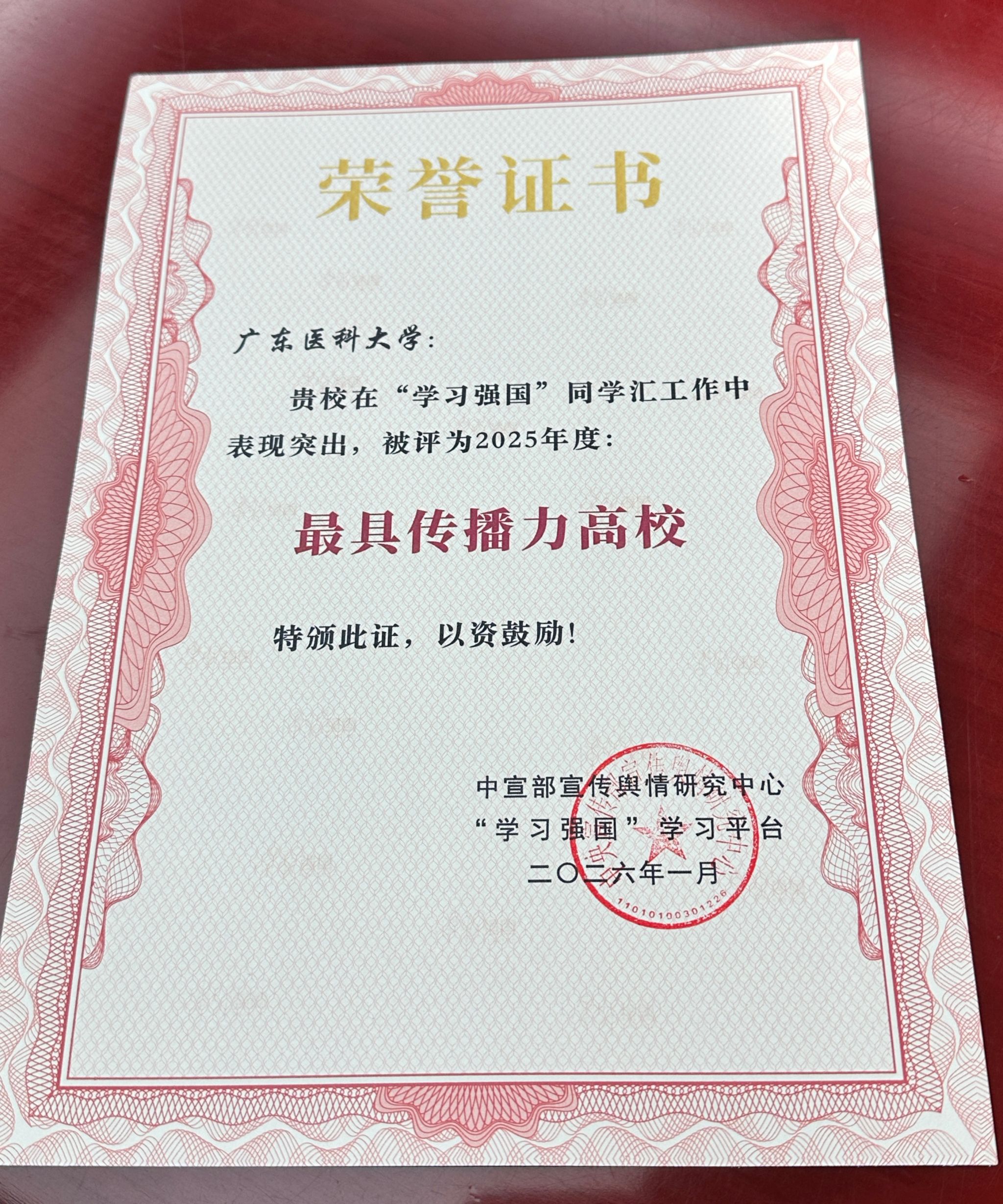 202619日,广东医科大学再传捷报,获中宣部宣传舆情研究中心、“学习强国”学习平台授予2025年度“学习强国”同学汇“最具传播力高校”荣誉称号,《广东医科大学丝路医行实践团:向新疆,出发》获年度人气作品奖,充分彰显了学校在网络思政教育领域的综合实力。