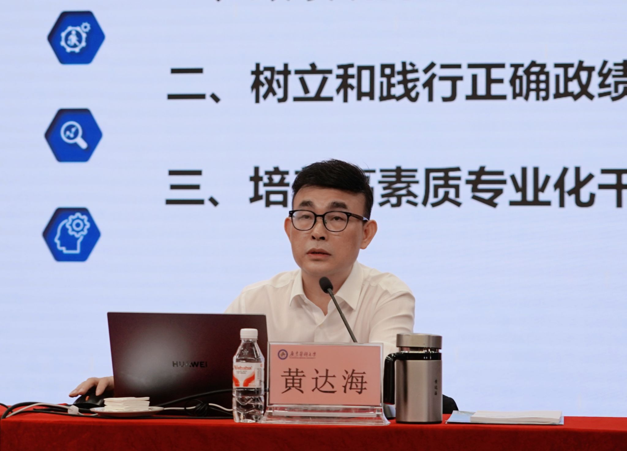 学校党委副书记黄达海以《树立和践行正确政绩观,培养高素质专业化干部队伍》为题作专题报告,从政绩观问题是根本性问题、树立和践行正确政绩观、培养高素质专业化干部队伍三方面展开。报告紧密结合学校发展情况和干部队伍实际,提出要突出政治引领,抓好理论武装这个思想根基;突出规划引领,抓好后继有人这个根本大计;突出能力引领,抓好教育培训这个关键环节;突出事业引领,抓好实践锻炼这个重要平台;突出导向引领,抓好考核评价这个助推机制;突出规矩引领,抓好日常监督这个核心制度,为高水平医科大学建设提供坚强人才支撑和组织保障。