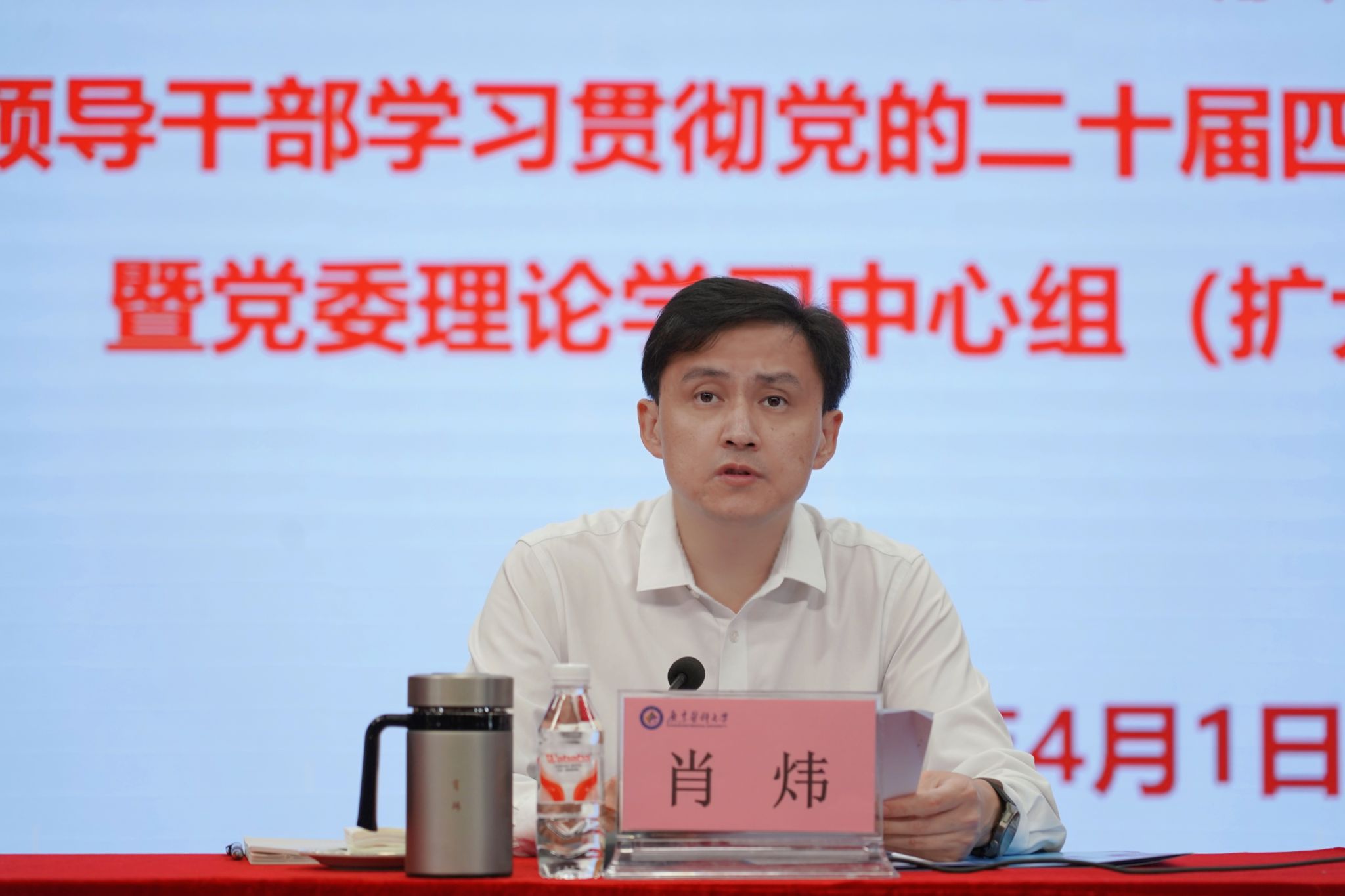 4月1日,广东医科大学领导班子树立和践行正确政绩观学习教育读书班、中层以上领导干部学习贯彻党的二十届四中全会精神专题研讨班暨党委理论学习中心组(扩大)学习会在两校区举行。会议以“深入学习贯彻党的二十届四中全会精神,以正确政绩观奋力推动学校‘十五五’高质量开局”为主题。学校党委理论学习中心组全体成员、校领导、全体中层干部、七八级职员及辅导员参加会议,会议由学校党委副书记、校长肖炜主持。