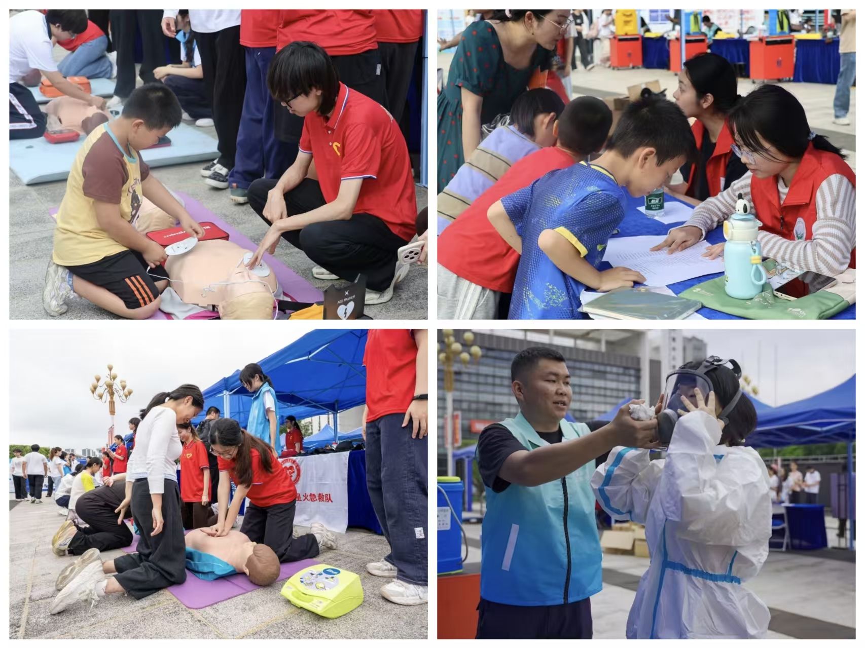 除了“硬核”装备展示,广场上还设置了多个互动教学点。在急救互救技能实操区,护理学院的师生志愿者现场演示心肺复苏和海姆立克急救法,并手把手指导围观同学练习。“按压深度5到6厘米,频率每分钟100到120次,大家记住这个节奏。”志愿者们一遍遍纠正动作,学生们学得认真。