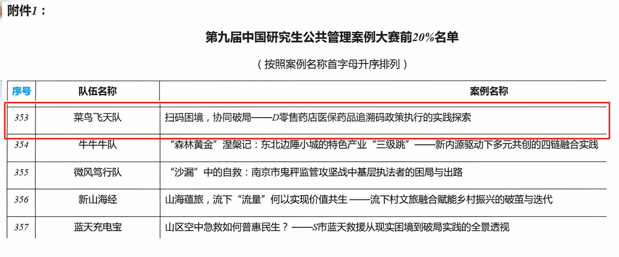 近日,第九届中国研究生公共管理案例大赛圆满落幕。本次大赛吸引来自全国268所院校的3115支队伍报名参赛,参赛师生1.53万人,竞争激烈。我校人文与管理学院2023级MPA“菜鸟飞天队”凭借案例《扫码困境,协同破局——D零售药店医保药品追溯码政策执行的实践探索》,在全国3115支参赛队伍中强势突围,成功跻身全国前20%,获得案例优秀奖。该案例由2023级MPA研究生林蔚同学担任队长,队员为2024级研究生朱倩莹、胡宏鹏,指导老师为陈小嫦、肖俊辉。
