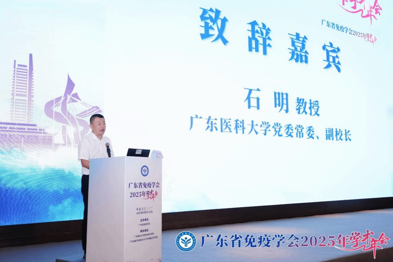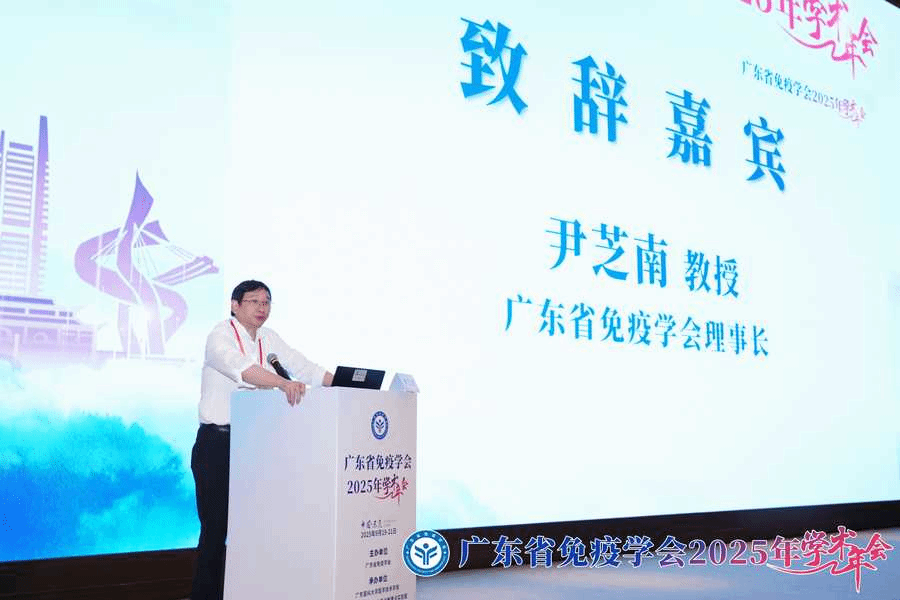 会议开幕式由广东省免疫学会副理事长廉哲雄教授主持,广东省免疫学会前理事长、中国免疫学会秘书长郑利民教授,广东医科大学党委常委、副校长石明教授,广东省免疫学会理事长尹芝南教授分别为开幕式致辞。