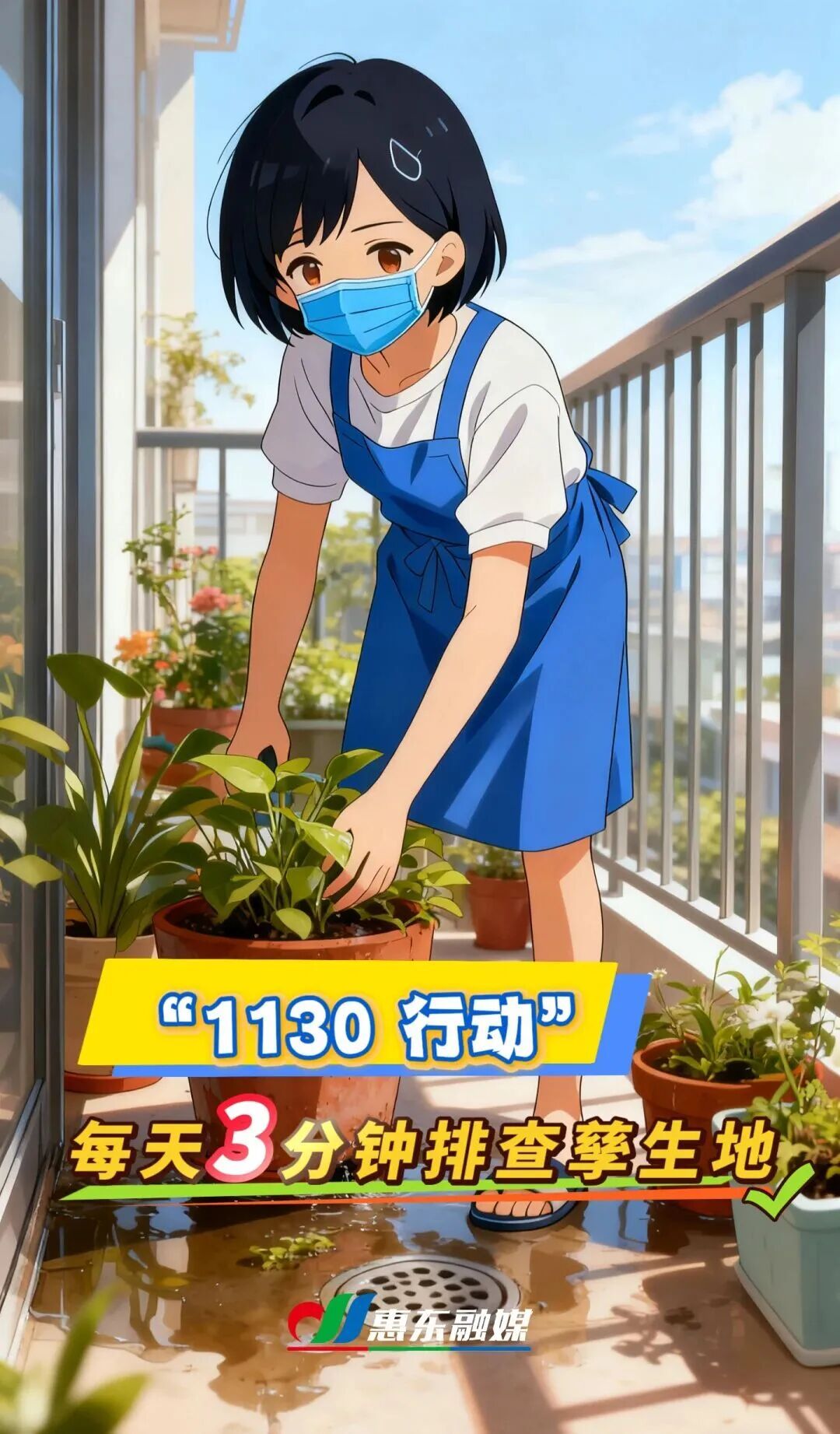 家庭每天3分钟排查孳生地:检查并清除房前屋后、阳台天台的积水点,积极推进“无蚊场所”建设。