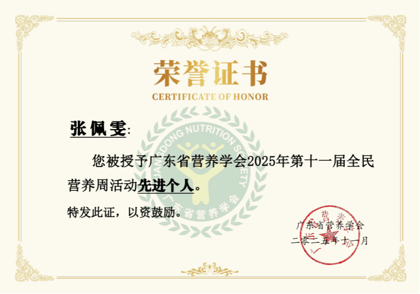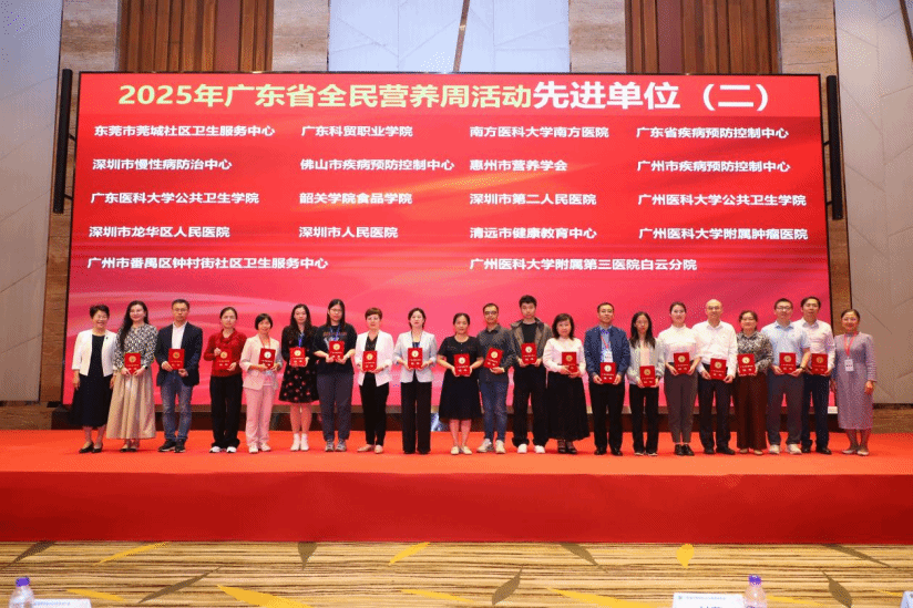 11月8日,广东省营养学会2025年学术年会在广州举行,广东医科大学公共卫生学院凭借在营养科普与健康传播中的卓越表现,被授予2025年第十一届“全民营养周活动先进单位”称号,营养与食品安全系副主任张佩雯博士荣获“先进个人”荣誉。