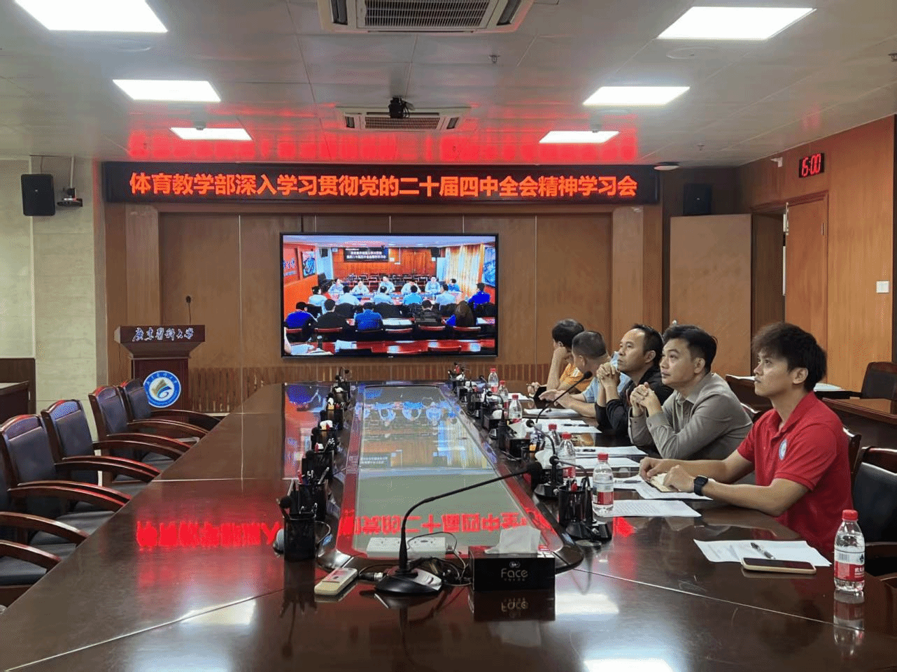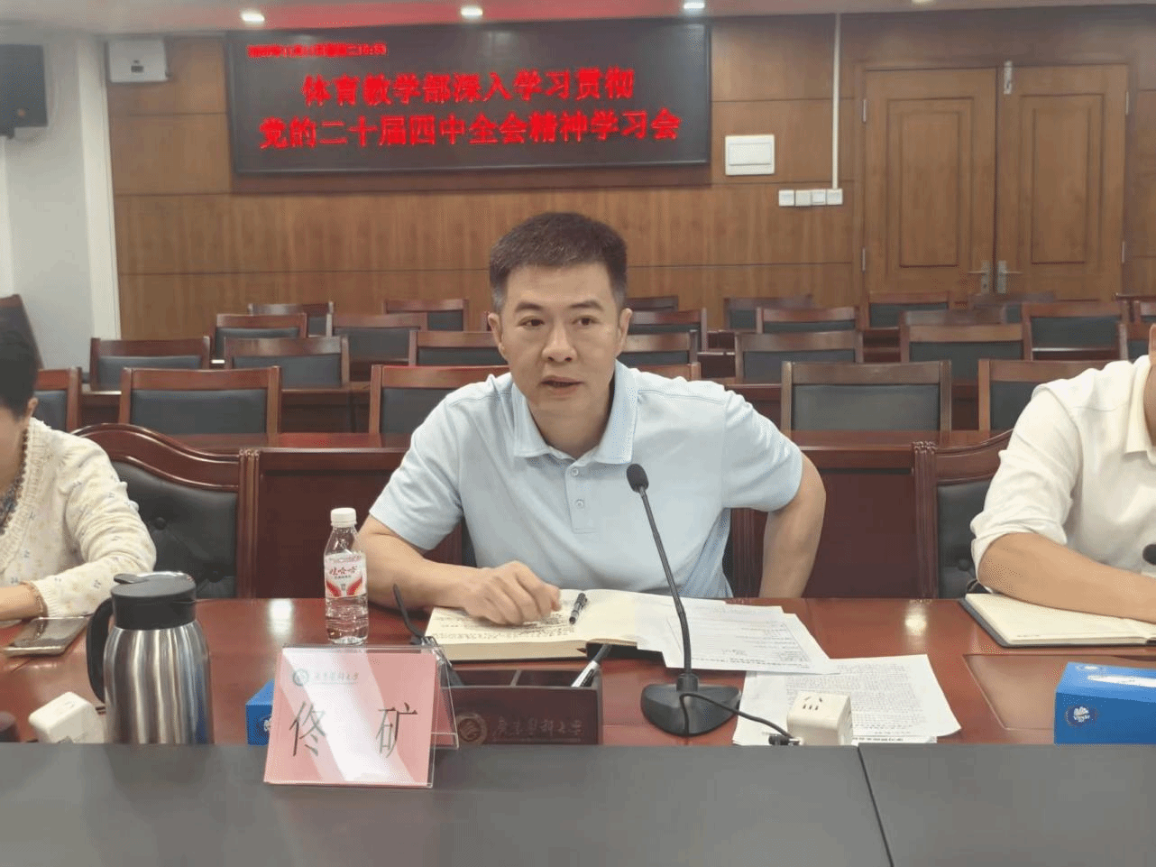 为深入学习贯彻党的二十届四中全会精神,以高质量党建引领体育事业高质量发展,2025年11月11日,体育教学部党总支部理论学习中心组学习会在东莞校区行政楼501第一会议室、湛江校区综合楼9楼第二会议室同步召开。学校党委常委、副校长佟矿出席,学校理论学习中心组列席旁听工作组第五组人员,体育教学部班子成员、党总支委员,各室(中心)正副主任,党支部书记及委员,办公室全体人员参加会议。会议由体育教学部党总支书记陈凯主持。