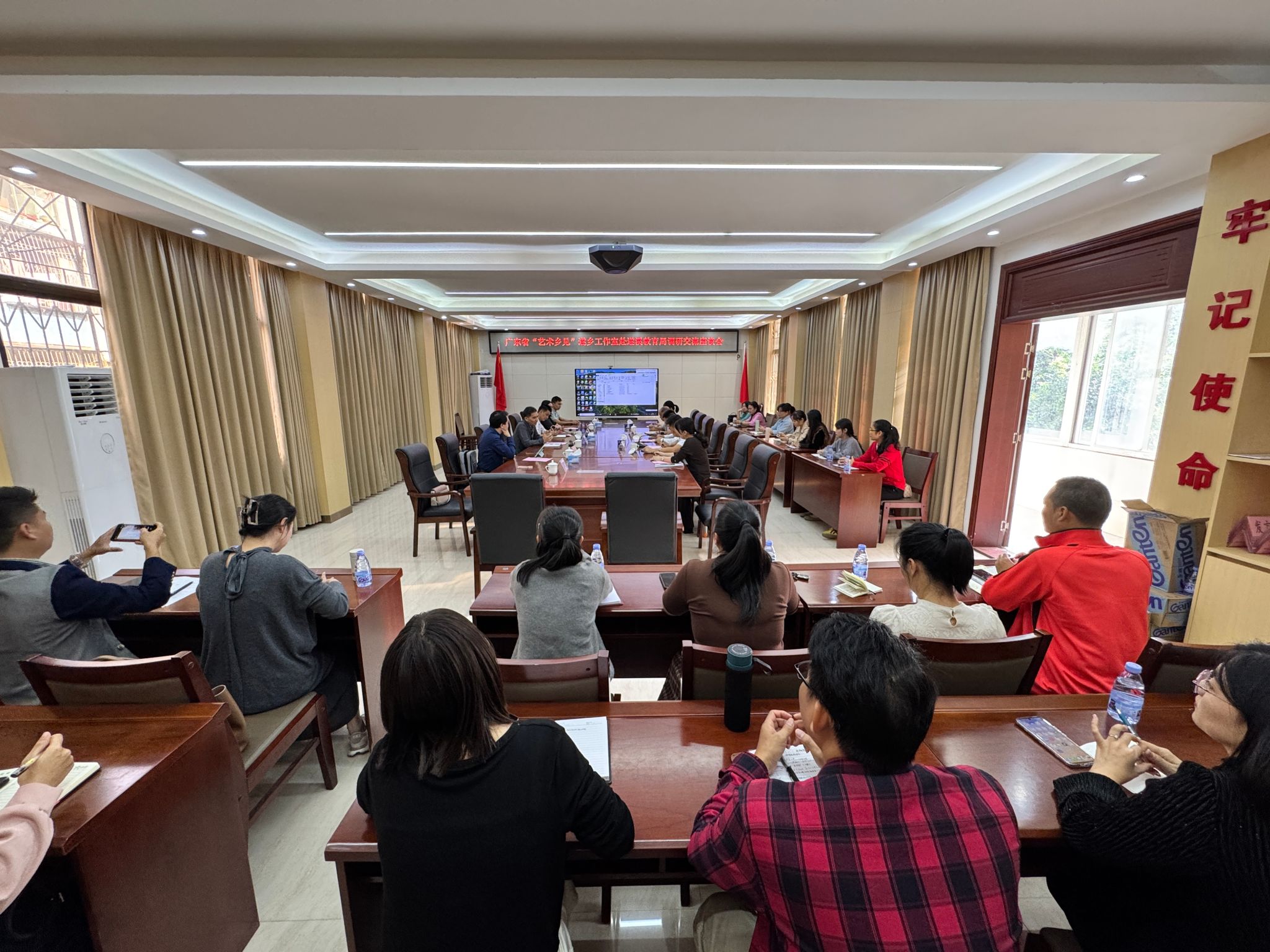 活动当天上午,工作室团队首站抵达遂溪县教育局,与县教育局党组书记、局长周炳辉,党组成员、副局长陈超铭等领导及县域主要学校艺术学科负责人展开座谈。周炳辉对工作室落地表示欢迎,认为高校艺术力量将为遂溪文化教育发展与百千万工程提供重要支撑。广东医科大学“双百行动”驻遂溪服务队队长陈炳权、人文与管理学院党委书记陈明则表态,学校将全力支持工作室建设,推动艺术服务与乡村需求精准对接,打造校地共建助力乡村振兴的示范样本。