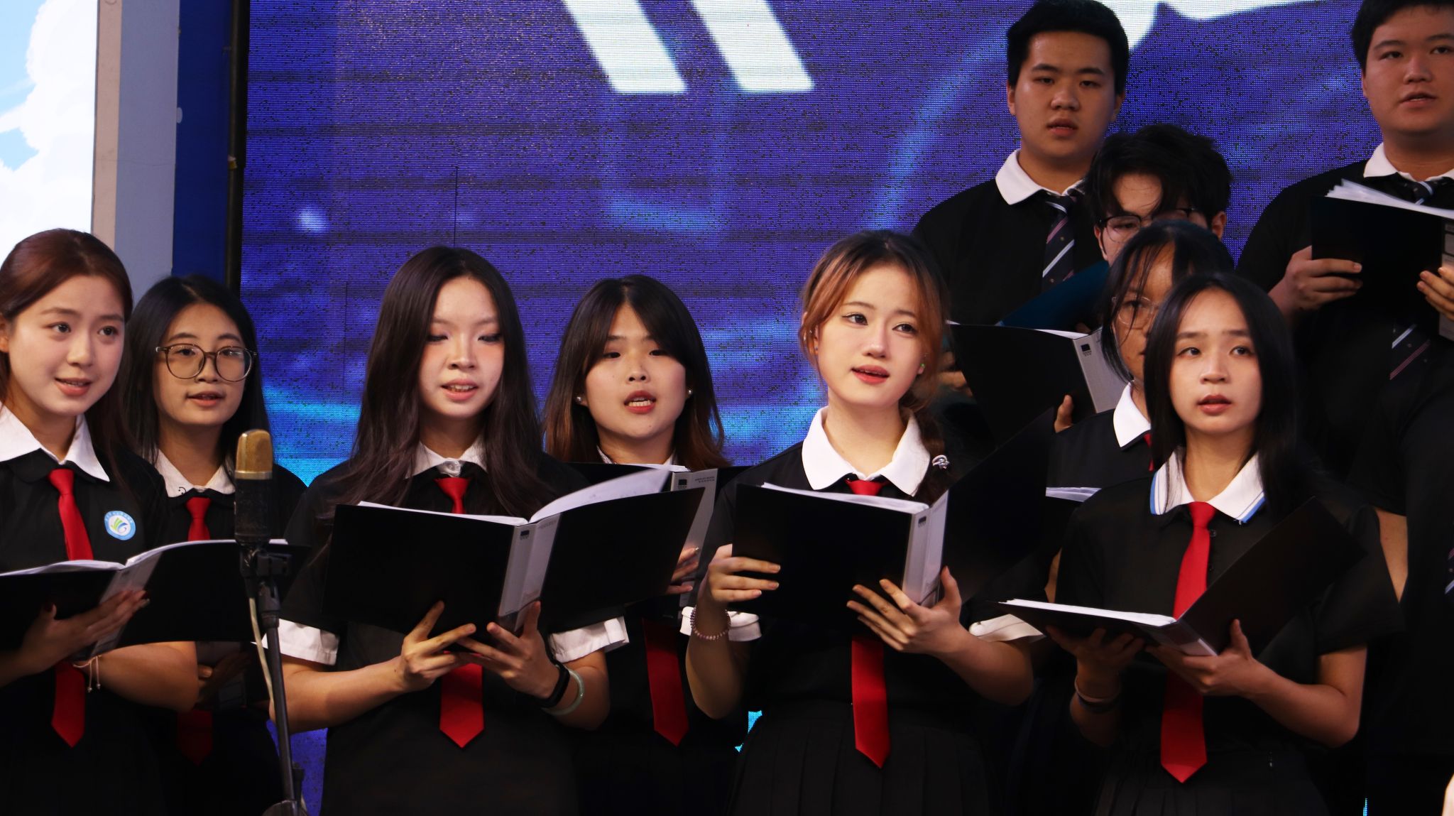 演出曲目丰富,九首混声合唱搭配三首小组唱,风格兼具深情与激昂,穿插钢琴、琵琶独奏更添韵味。观众随节奏轻拍,氛围温馨。压轴曲《我和我的祖国》响起时,全场挥旗齐唱,氛围达至顶点。