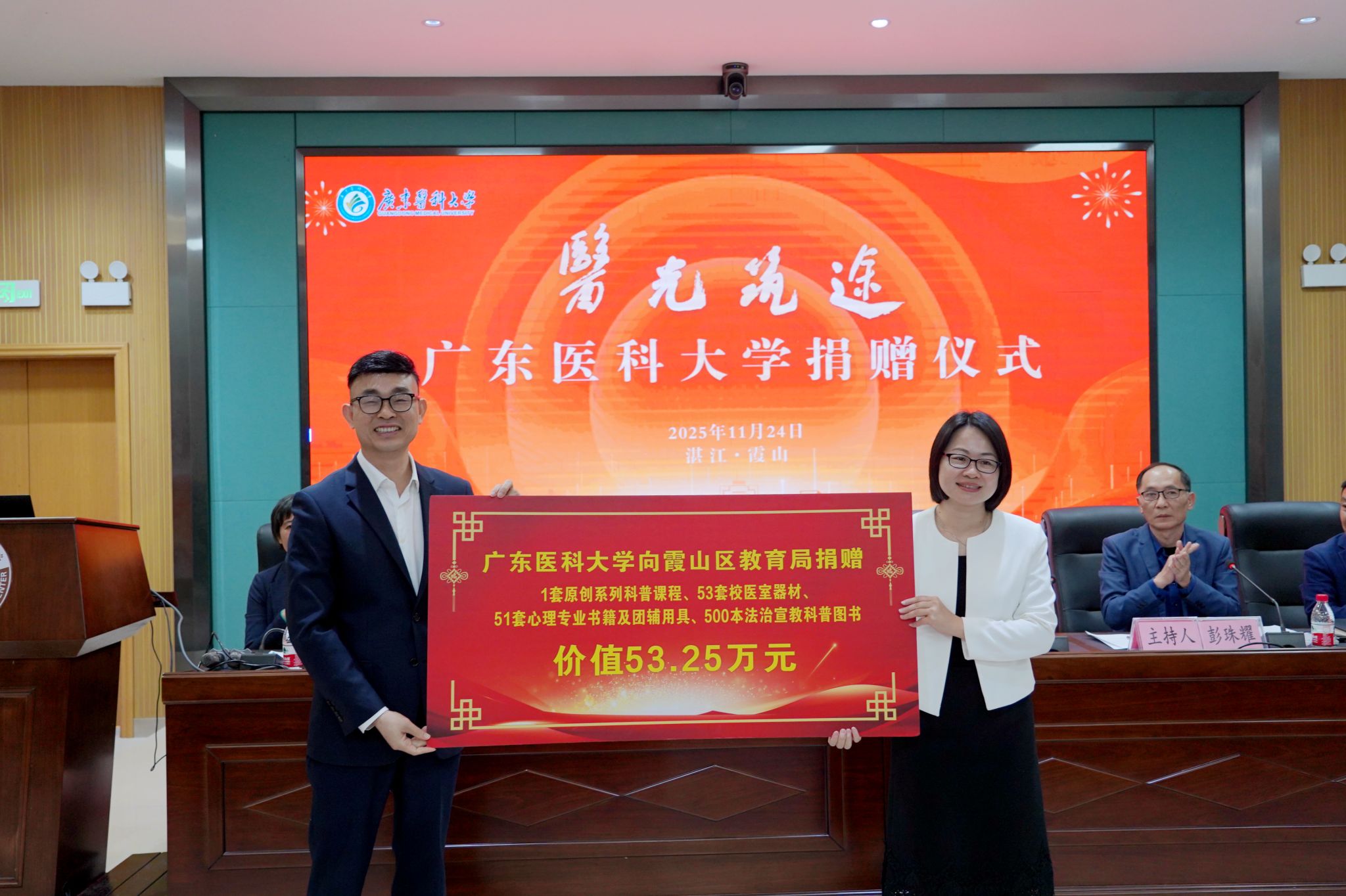 霞山所需、广东医所能。学校党委副书记黄达海代表学校向霞山区教育局捐赠了原创科普课程、校医室器材、心理辅导用具、法制宣教科普图书等。学校团委书记陈炳权、附属第二医院党委书记陈婷代表学校分别进行了“含羞草”未成年人性教育和“共建健康学校”专项捐赠。紧密结合霞山区在教育与健康领域的实际需求,广东医科大学精准送去了科普资源、医疗设备和专业课程,有效补齐了当地在青少年科普教育、校园健康服务及心理关怀等方面的资源缺口,切实提升了当地青少年的健康素养与法治意识,为霞山区基础教育与卫生事业注入了专业力量。