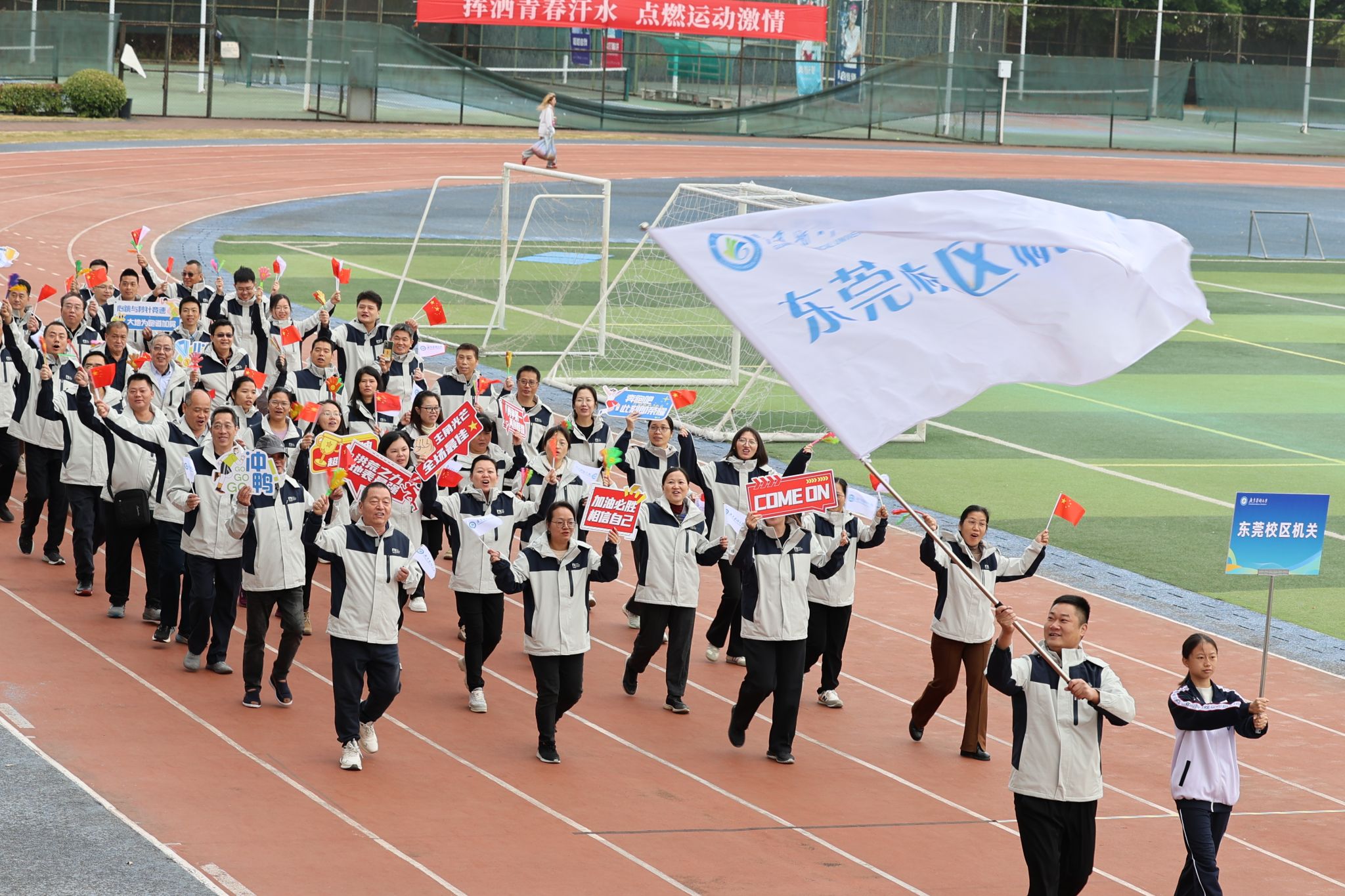 开幕式上,来自机关的60多名干部职工精神饱满、意气风发,迈着铿锵有力的步伐,齐步走过主席台。“机关机关、奋勇争先”,嘹亮的口号声喊出了东莞校区机关工会分会贯彻落实学校党委决策部署、精诚服务广大师生的决心态度,展现了机关工会人踔厉奋发、笃行不怠的精神风貌。在《乘风破浪》表演中,机关人作为参与人数最多的工会分会,传递着积极向上的精神风貌和团结协作的团队精神。