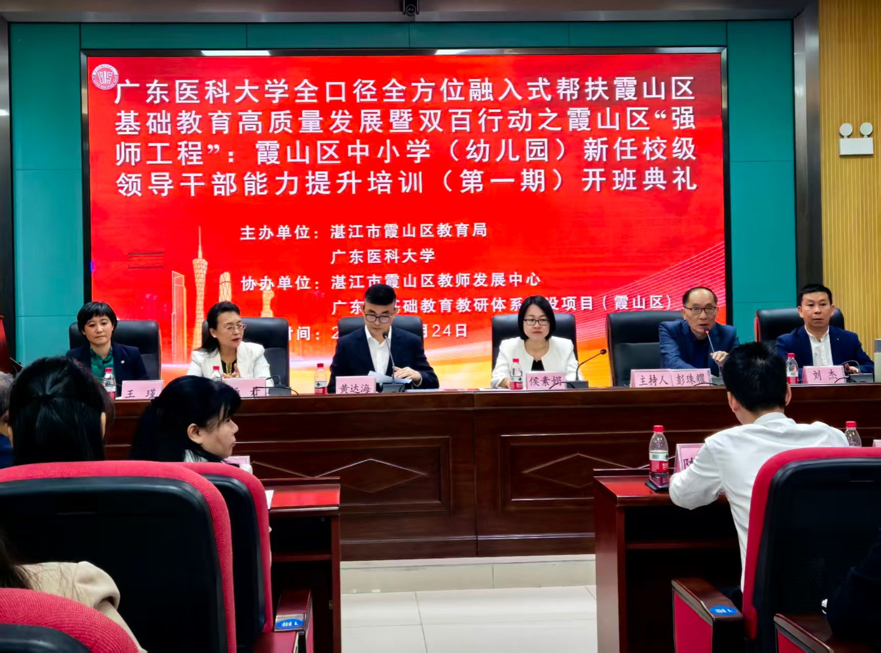 11月24日,广东医科大学全口径全方位融入式帮扶霞山区基础教育高质量发展暨双百行动之霞山区“强师工程”——新任校级领导干部能力提升培训(第一期)开班典礼在霞山区教师发展中心一楼报告厅隆重举行。霞山区委常委、副区长侯素娟,学校党委副书记黄达海,校长办公室、高等教育研究与教师发展中心、学校团委、广东医科大学附属第二医院等负责同志出席活动。开班仪式由区教育局党组书记、局长彭珠耀主持。