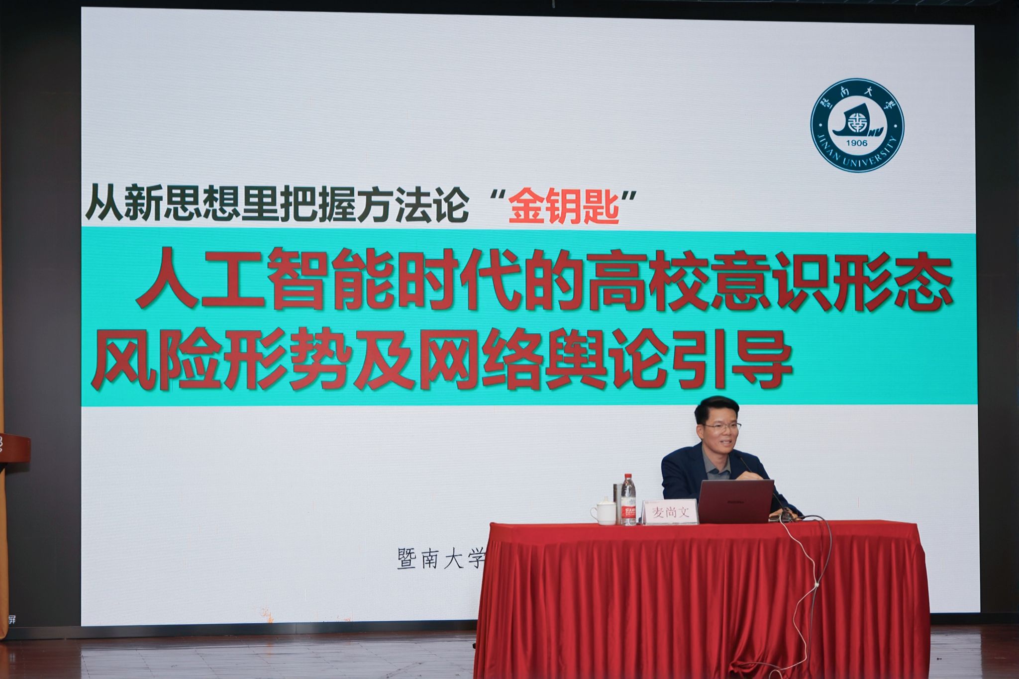 本期论坛邀请暨南大学党委医学工作部部长麦尚文教授主讲。他以《人工智能时代的高校意识形态风险形势及网络舆论引导》为题,以“当前舆论热点传播的新态势及系统性应对思考”为核心,结合意识形态理论和实践案例,剖析了当前高校网络意识形态领域的风险隐患、主要表现和应对举措,指出重在“前置防范”,要把好“时效度”。报告具有政治站位高度、思想理论深度、实践指导力度,为我校学工队伍提升网络舆情引导能力、筑牢校园意识形态防线、落实立德树人根本任务提供了宝贵经验。
