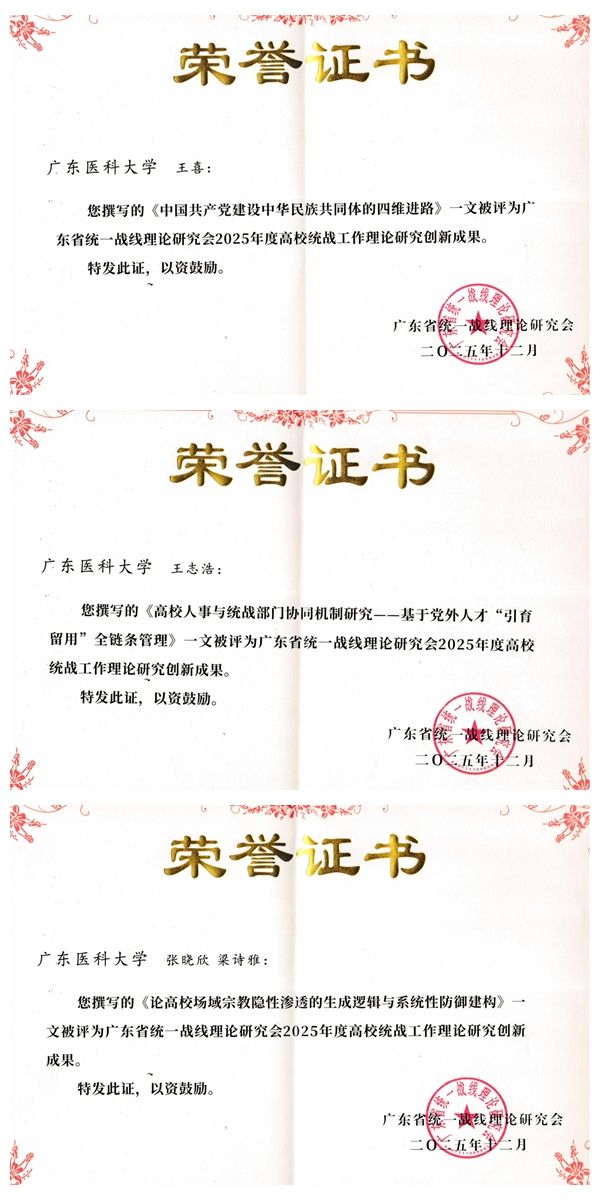 会议对广东省统一战线理论研究会过去一年的工作进行了总结,对2025年度高校统战理论研究创新成果进行表彰。今年全省共收到各高校报送成果达317篇,经多部门及专家评审,评选出创新成果50篇,其中我校马克思主义学院王喜的《中国共产党建设中华民族共同体的四维进路》、外国语学院王志浩的《高校人事与统战部门协同机制研究——基于党外人才“引育留用”全链条管理》、第一临床医学院张晓欣、组织统战部梁诗雅的《论高校场域宗教隐性渗透的生成逻辑与系统性防御建构》获表彰。