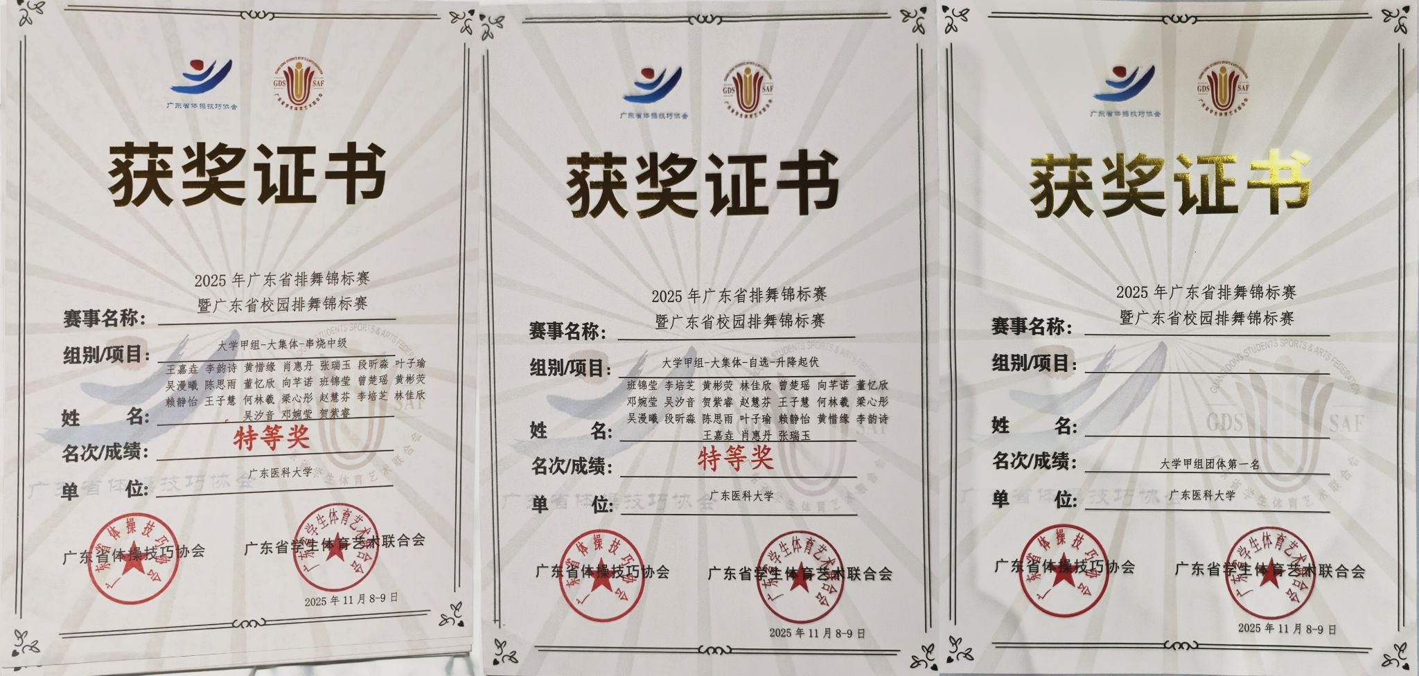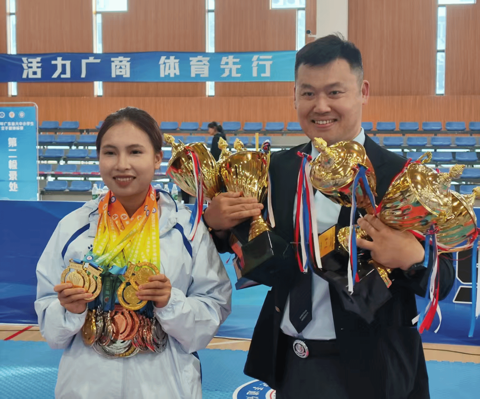 今年以来,我校体育运动代表队接连在多项省级以上体育赛事中捷报频传、屡创佳绩,获国家级奖项17项、省级奖项138项,打破多项赛事历史纪录,学校在体育领域声誉和影响力显著提升。国家级赛事荣获2025年全国排舞锦标赛双冠、全国健身气功锦标赛1金2银1铜、第十三届中国大学生空手道锦标赛2银4铜;省级赛事荣获广东省大学生空手道锦标赛8金12银7铜团体总分第一名、广东省大学生男子8人制足球锦标赛冠军、广东省排舞锦标赛暨广东省校园排舞锦标赛3金团体总分第一名、广东省第一届大学生体适能锦标赛1金4银5铜团体总分一等奖(排名第二)广东省大学生田径锦标赛3银2铜团体总分一等奖(排名第二)、广东省大学生排球锦标赛女子甲组一等奖(排名第二)、广东省大学生气排球锦标赛校园男子组一等奖(排名第二),广东省第十五届大学生排球联赛男子组一等奖(排名第七)、广东省第十五届大学生排球联赛女子组一等奖(排名第七)。骆熙彤同学是建校以来首位全运会运动员,也是我省唯一以在校大学生身份参加十五届全运会空手道项目的运动员;梁彦熙同学打破省大运会女子100米蛙泳31年赛会纪录;徐奕珊打破女子200米校纪录,邓轩帆打破尘封21年的男子100米校纪录。