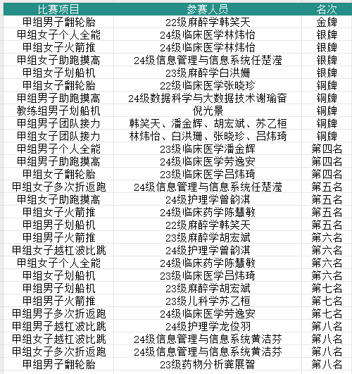 本次比赛设有多项兼具力量、速度、耐力和协调性的综合体能项目。广东医健儿们在赛场上全力以赴,展现了出色的体能素质与顽强的拼搏精神。其中,韩笑天同学在男子翻轮胎项目中力压群雄,为学校夺得了宝贵的金牌。林炜怡同学表现尤为突出,一人独揽女子火箭推银牌和个人全能银牌两项殊荣。任楚滢、白洪姗分别在女子助跑摸高和女子划船机项目中摘得银牌。此外,张晓珍、谢瑜奋分别在女子翻轮胎、男子助跑摸高项目中获得铜牌,倪光景教练更是在教练组男子划船机项目中赢得铜牌,体现了师生同场竞技、共展风采的活力。