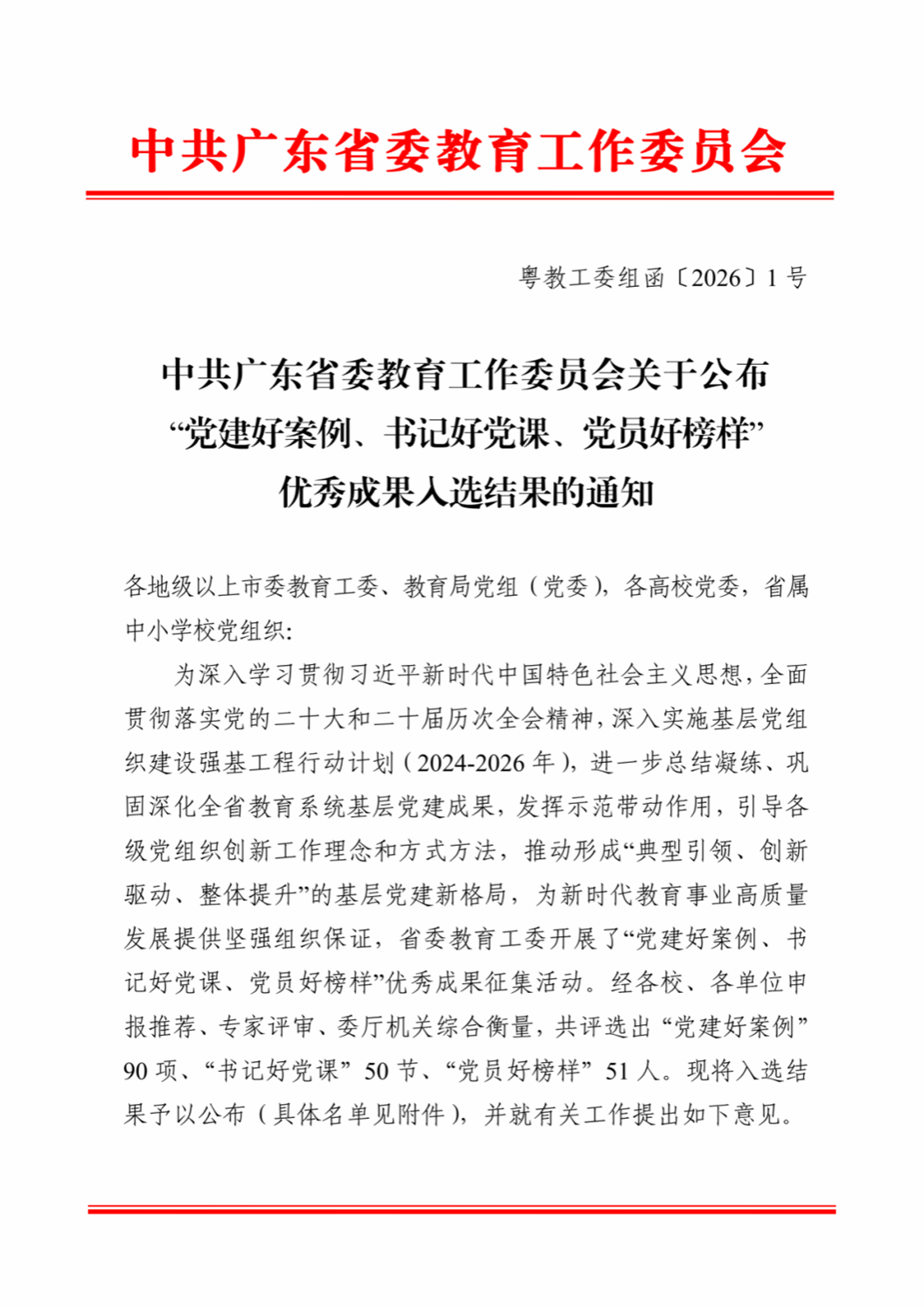 近日,广东省委教育工委公布“党建好案例、书记好党课、党员好榜样”优秀成果入选名单,我校报送的党建工作案例《以“两点一线三支撑”工作法 激发党建引领高质量发展新动能 》入选“党建好案例”,成为全省教育系统基层党建工作的示范成果之一。