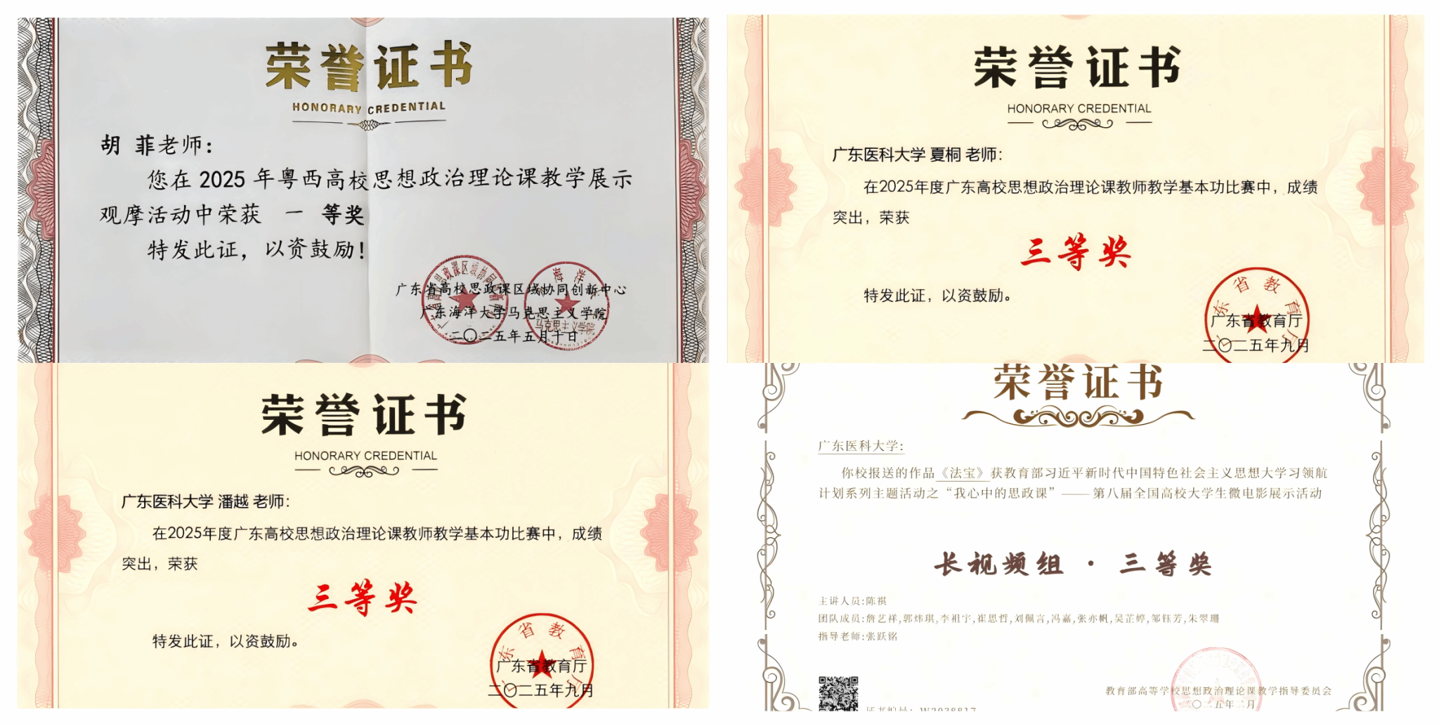 竞赛引领与成果涌现。成功举办2025年校级思想政治理论课青年教师教学比赛,其中两位获奖教师被推荐参加省级思政课教师教学基本功比赛,获三等奖;两位教师被推荐参加粤西高校思政课教学展示,分别获一等奖、三等奖。教学成果奖取得新突破,教师主持或参与完成的成果获省级特等奖、一等奖、二等奖各1项。一位教师指导学生获教育部“我心中的思政课”微电影展示活动三等奖。