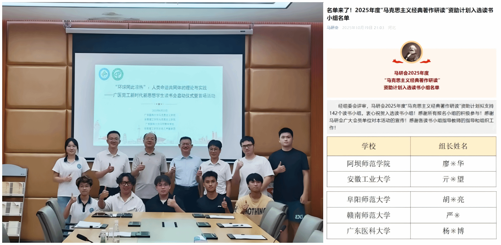 理论武装与经典传承。结合中国人民抗日战争暨世界反法西斯战争胜利80周年等重要节点,打造“铭记抗战历史,弘扬抗战精神”为主题的“思政第一课”精品课堂。指导学生深入开展马克思主义经典文献读书活动,与东莞理工学院马院联合举办“广医莞工新时代新思想学生读书会”,教师指导的读书小组成功入选马研会2025年度“马克思主义经典著作研读”资助计划。
