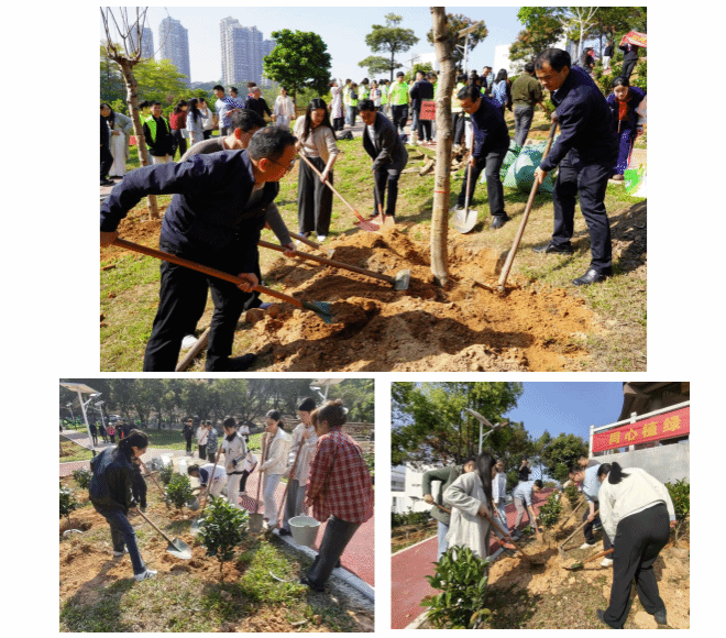 本次植树活动得到了学院校友分会大力支持,校友们捐赠了5株凤凰木。此外,学院团委书记林茹惠老师带领着学院青年志愿者们前往黎贝岭村文化主题公园,共赴春日植绿之约,让青春担当与生态美景相融共生,为大朗镇增添了一抹亮眼的新绿。