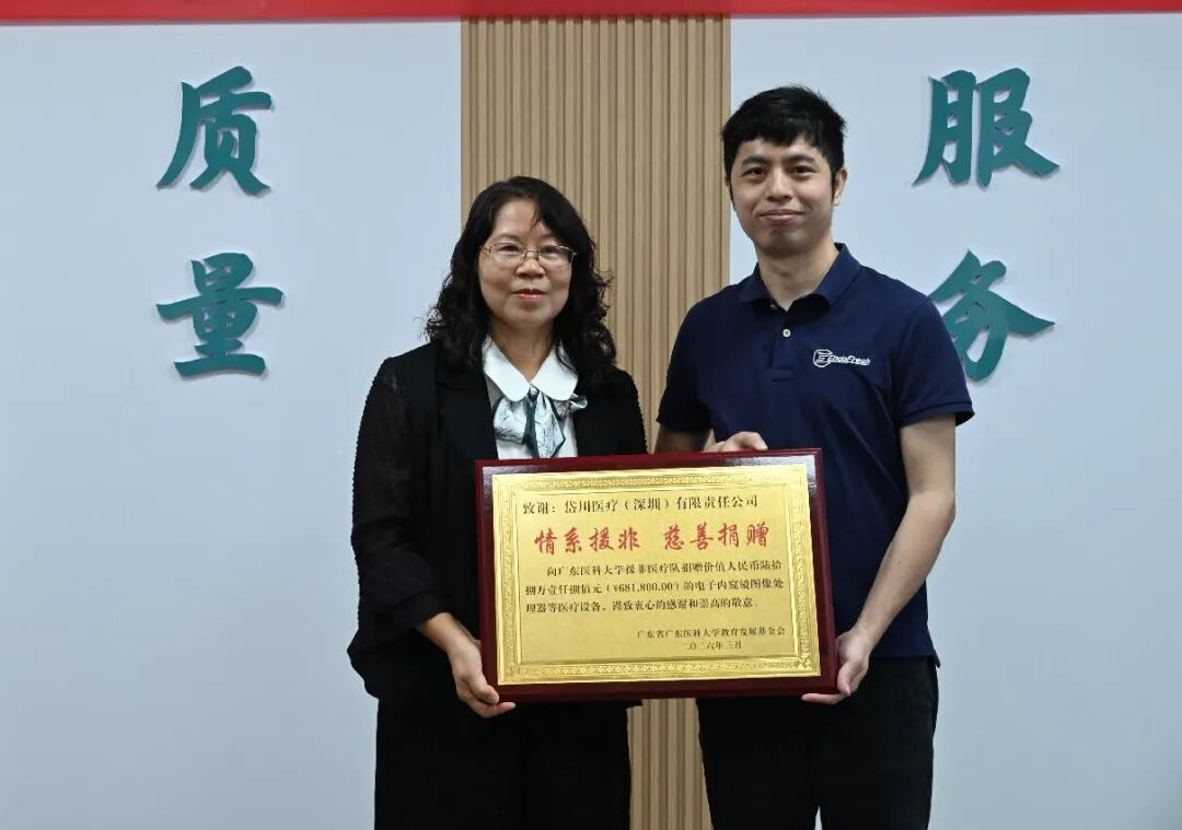 在全体人员的共同见证下,校企双方正式签署捐赠协议,顺利完成医疗设备交接。学校教育发展基金会现场为岱川医疗颁发捐赠证明及致谢牌匾,以铭记这份暖心善举,定格校企携手援非的温情瞬间。