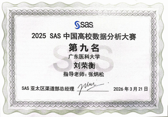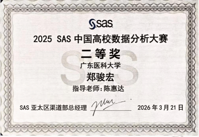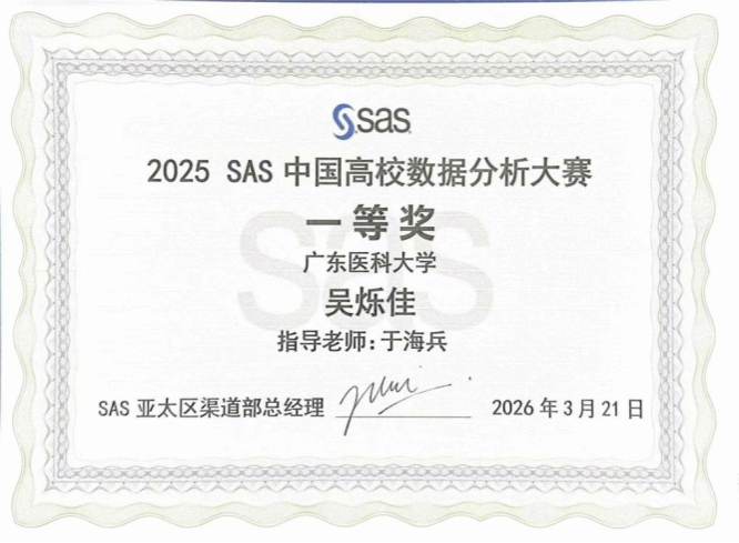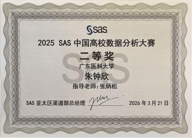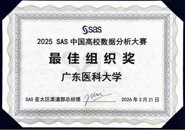 2026年3月20日至21日,2025SAS中国高校数据分析大赛全国总决赛在苏州成功举办。广东医科大学公共卫生学院学生在此次赛事中表现卓越,由2024级流行病与卫生统计学、公共卫生专业的刘荣衡、李思苒、林晓丹组成的团队勇夺全国第九名,刷新学校最佳成绩,并获3000元奖金。另有1支团队获全国一等奖,3支团队获全国二等奖,1支团队获全国三等奖,学校荣获“最佳组织奖”称号。