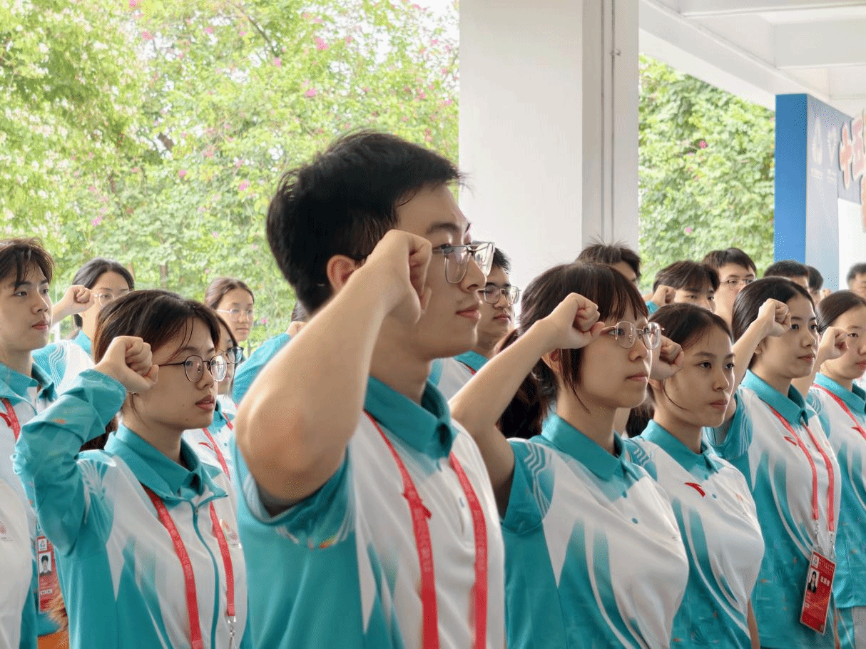 志愿者代表欧智康同学作表态发言,将以饱满的热情、专业的素养投入服务,展现广东医科大学学子的青春风采。在领誓人的带领下,全体志愿者举起右拳,庄严宣誓。铿锵有力的誓言回荡在志愿者之家,既是对赛事的郑重承诺,也是对青春担当的生动诠释。