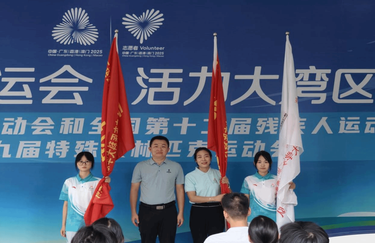誓师大会现场,石明副校长为十五运会和残特奥会广东医科大学赛会志愿服务队、临时党支部、临时团支部授旗,让党旗、团旗高高飘扬在赛事一线,为广东医志愿者凝聚思想共识、筑牢组织根基,确保各项赛事服务工作方向明确、高效推进奠定扎实基础。