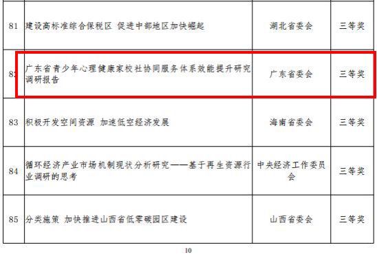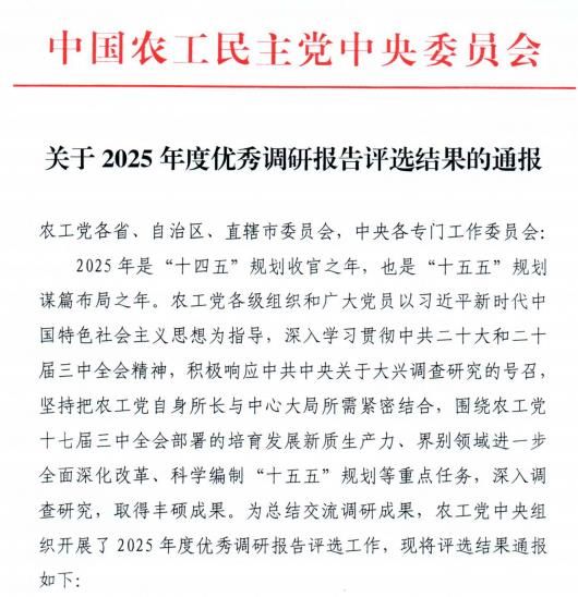 2025年12月17日,农工党中央办公厅印发了《关于2025年度优秀调研报告评选结果的通报》,评选工作按照“以质量为优先”的评选标准,经过部门初筛、专家评审、综合评价等环节,并报农工党中央领导审定,农工党广东省委会报送的我校人文与管理学院褚成静、池文华撰写的调研报告《广东省青少年心理健康家校社协同服务体系效能提升研究调研报告》获得三等奖。