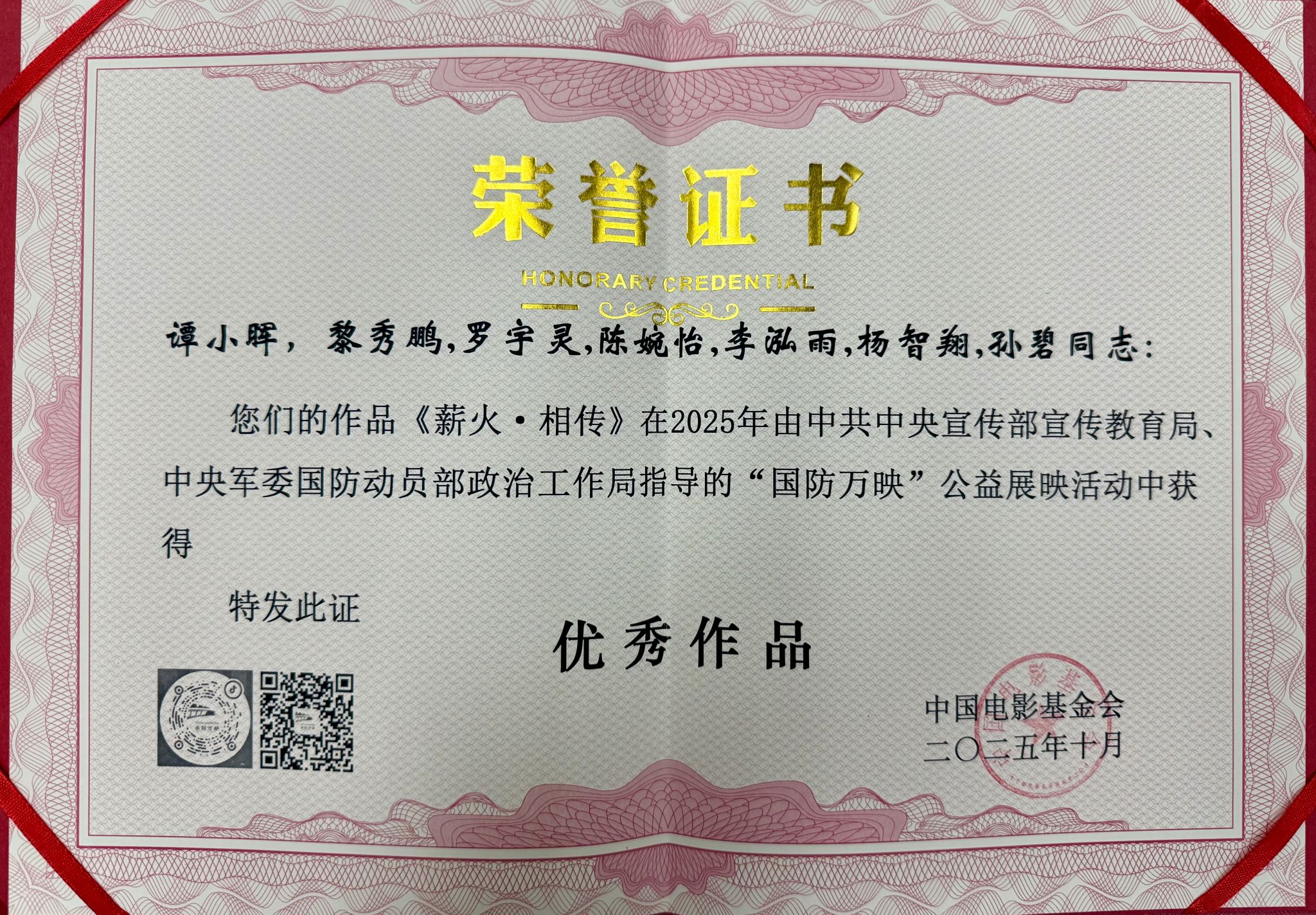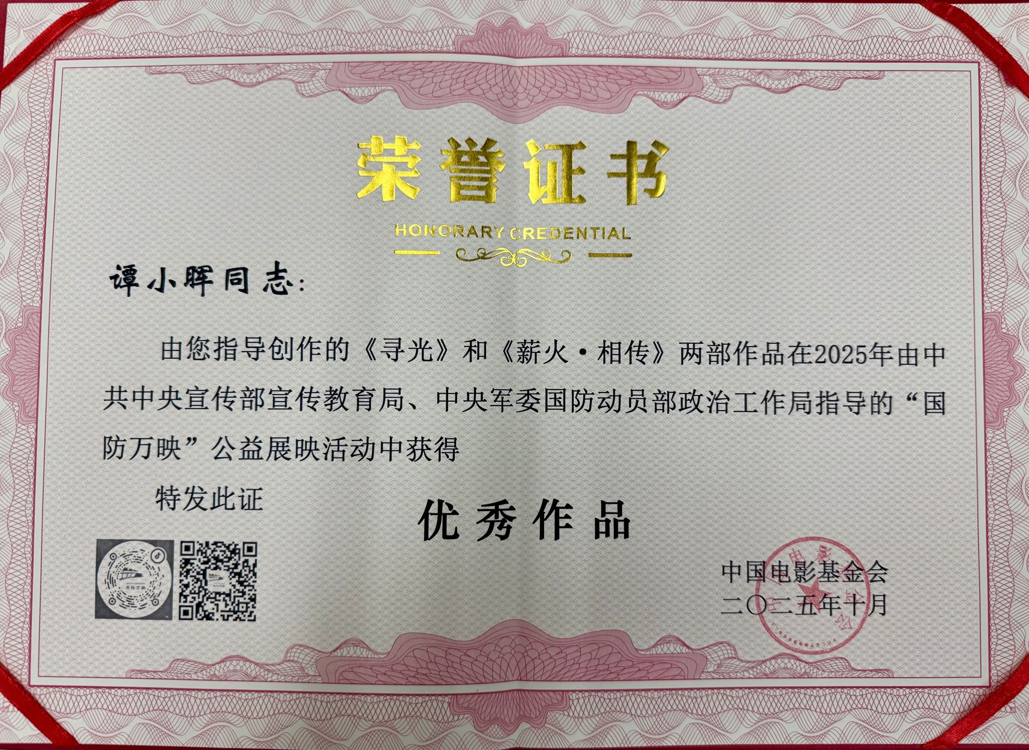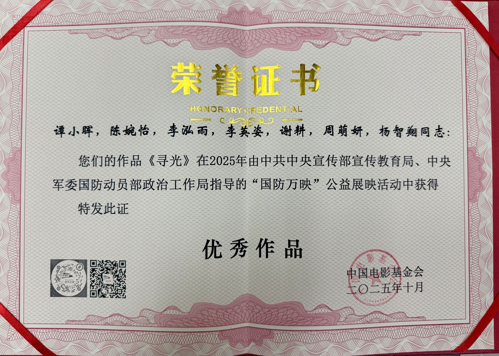 2025年正值中国人民抗日战争暨世界反法西斯战争胜利80周年,本届活动以此为主题,吸引了全国近四百所高校、八千余所中小学及两万多家单位参与,竞争激烈。我校作品凭借深刻的思想内涵与精良的艺术表达,赢得专家评委一致认可,最终斩获殊荣。中国电影基金会特此发函,对负责组织创作的武装部谭小晖老师予以表彰。