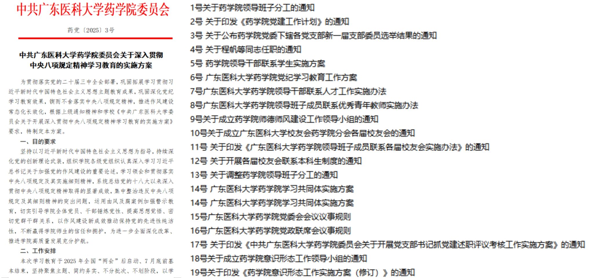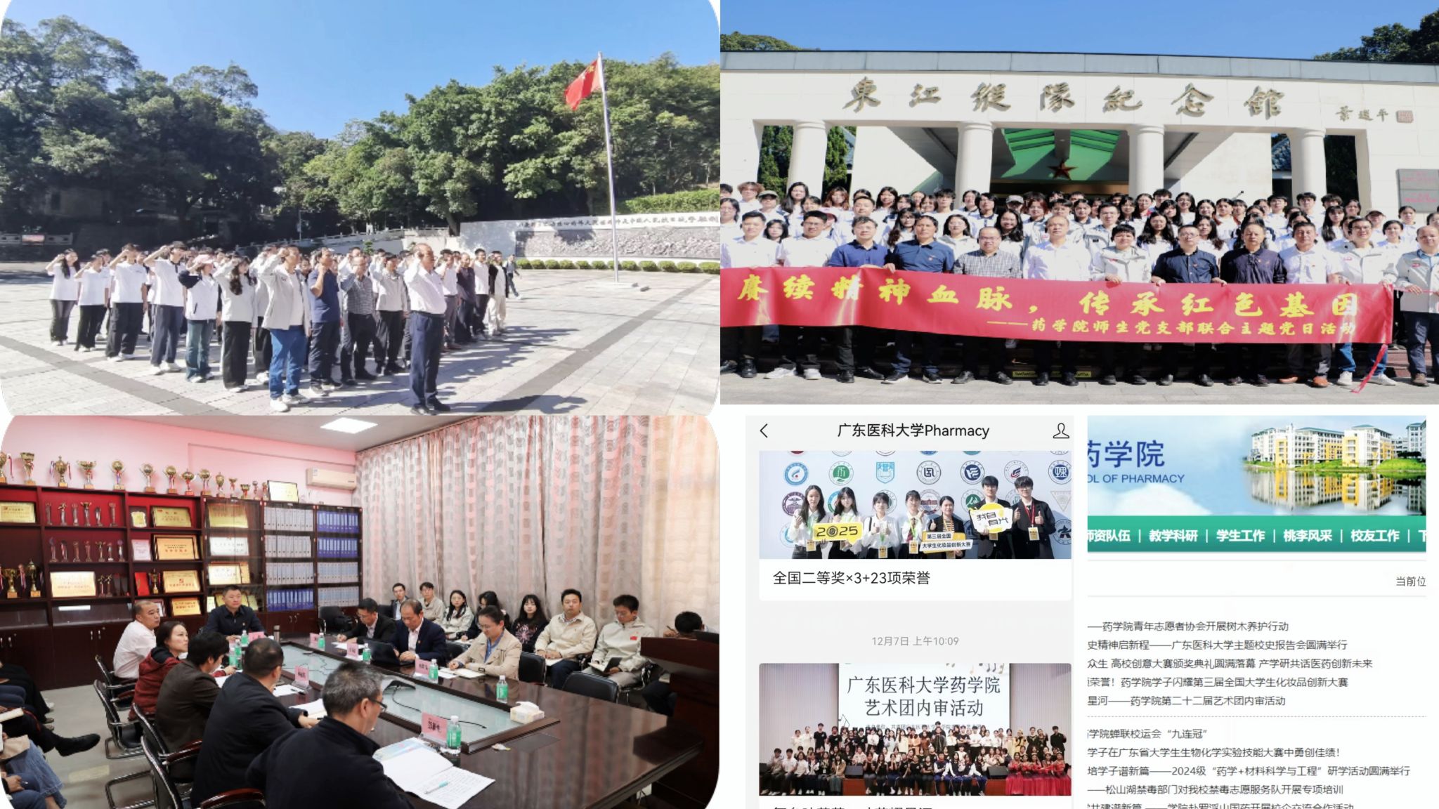 党建品牌创特色,思政育人结硕果。学院深化“党建+”融合模式,践行“1-2-6-1”党建特色发展战略(即以1个中心、2个重心、6个抓手、实现1个根本),开展“党建+科研育人”“党建+创新创业”“党建+社会实践”等系列活动。全年制定制度性文件10项,通过“书记院长信箱”等机制办结诉求50余项。党建工作成果丰硕,学院党委连续2年获校党建考核“优秀”,药学院团委获评“广东省五四红旗团委”,不断创新和优化学习载体,举办教师“党课开讲啦”等特色活动,共录制并推荐6堂精品党课进行展播,党建队伍成员获多项省级、校级荣誉。