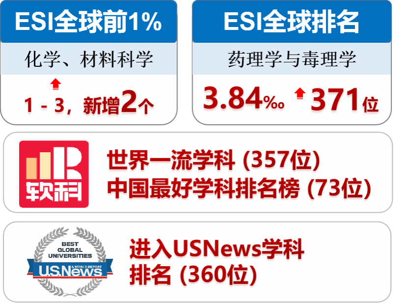 学科排名跨台阶,博士点建设启新程。药理学与毒理学、化学、材料科学三个学科ESI全球排名持续提升。药学学科首次进入USNews全球排名(第360位)和软科世界一流学科排名(第357位),并上榜软科中国最好学科排名(前47%)。学院积极推进一级博士点学科建设,获批学校博士学位点重点建设与培育项目3项,其中“药学博士学位授权一级学科”获重点建设项目,药学博士专业学位授权点及纳米科学与工程博士学位授权一级学科建设获立项重点培育项目。