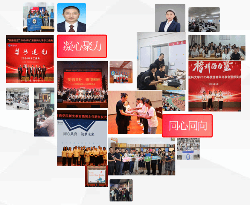 践行“三同法则”,即“目标同频、行动同轨、成果同享”理念,以学科建设为龙头,持续深入开展“我为群众办实事”实践活动,完成实事10项,向学校提交高质量提案8份,统战工作提案获广东省侨联采用。《多元赋能・破“简”蜕变——求职竞争力提升计划》获校级“我为同学做实事”立项。与护理学院联合打造“服务有特色、育人有方法、成长有支撑”的三有书院,并成功助推书院加入全国高校书院联盟,为师生成长搭建多元平台。聘任6名兼职班主任,开展“献花仪式”“我与老师影留念” 等尊师重教活动;聘任6名知名企业专家担任职业发展导师,开展20余次个人生涯咨询、7次团体考研深造辅导课程。开展“访企拓岗”专项行动,走访企业 27家,新增7家社会实践基地;校领导丁元林副校长带队走访用人单位45家,开拓就业岗位180余个,助推毕业生高质量就业。聚焦庆祝中华全国总工会成立100周年,开展“传承百年工运精神,凝聚育人奋进力量”主题活动,深入开展“送温暖”等关爱活动,丰富教职员工文化生活。学院工会分会连续五年获评校先进集体;连续两年在“读懂中国”活动中获评先进集体;在大学生职业规划大赛中获优秀组织奖;征兵工作获评学校“先进单位”。教师获批中国外文局重大项目;《医学人文英语》入选国家规划教材;荣获广东省教学成果二等奖;《医学人文英语》荣获省优秀教材;《中华医药文化》入选中国外文局规划教材;广东省教师创新大赛中荣获三等奖;外研社杯广东省赛中斩获金奖;12名优秀学子获世界知名高校录取,实现高质量升学新突破。组建大学生新文科实践创新大赛团队,选派3 支队伍参加省赛,斩获“两银一铜”,在校赛中荣获“1金两银”,学院获评教师和学生优秀组织奖。创建校级优良学风标兵班1个、优良学风班6个、零补考班1个(学院近三年之首创)。2025届毕业生专四总通过率达88.36%,同比提升22.27个百分点,远超全国平均水平,创学院近八年之最,人才培养质量显著提升。