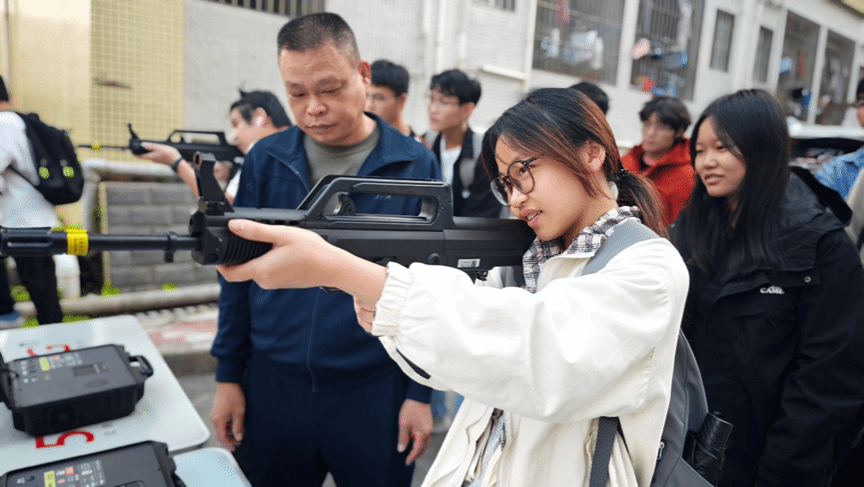 同期,咨询点旁边的模拟轻武器射击体验成为焦点。体验区配备高仿真激光模拟射击系统,还原95式自动步枪等现役轻武器操作场景。清脆的“枪声”、跳动的“弹着点”与实时显示的“环数”,让学子仿佛置身真实射击场。“扣动扳机的瞬间,我感受到了军人的责任与荣耀,这种体验太震撼了!”一名参与体验的学生兴奋表示。此次体验不仅锻炼了学生的心理素质和手眼协调能力,更在他们心中播下了“强军有我”的种子。