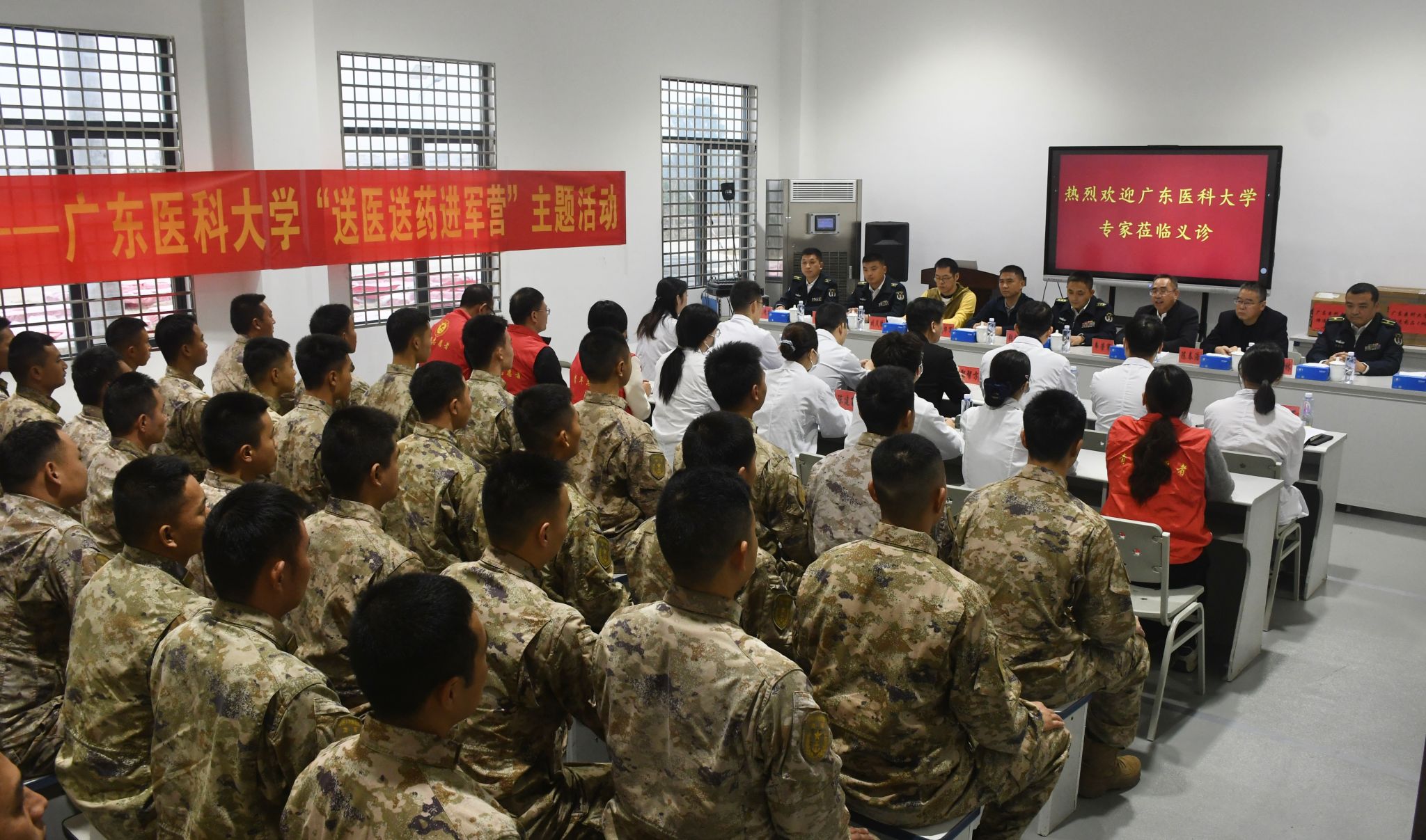 2026年1月15日上午,广东医科大学组织医疗专家团队赴海军某部营区,举办“情系子弟兵 健康送军营”送医送药活动。此次活动旨在深化军校共建,为基层官兵提供健康科普、疾病诊疗与急救技能培训服务,受到部队官兵的热烈欢迎和好评。