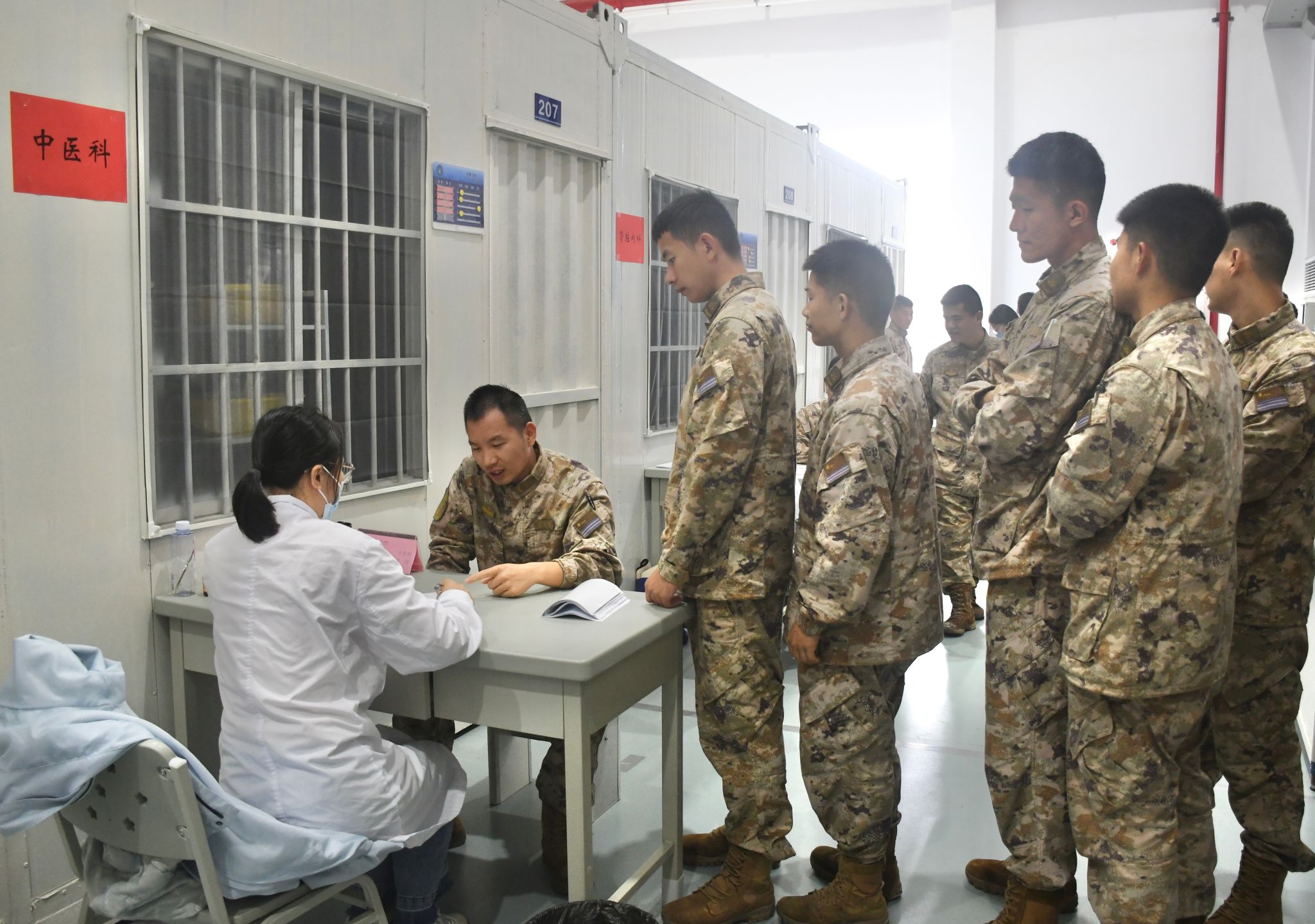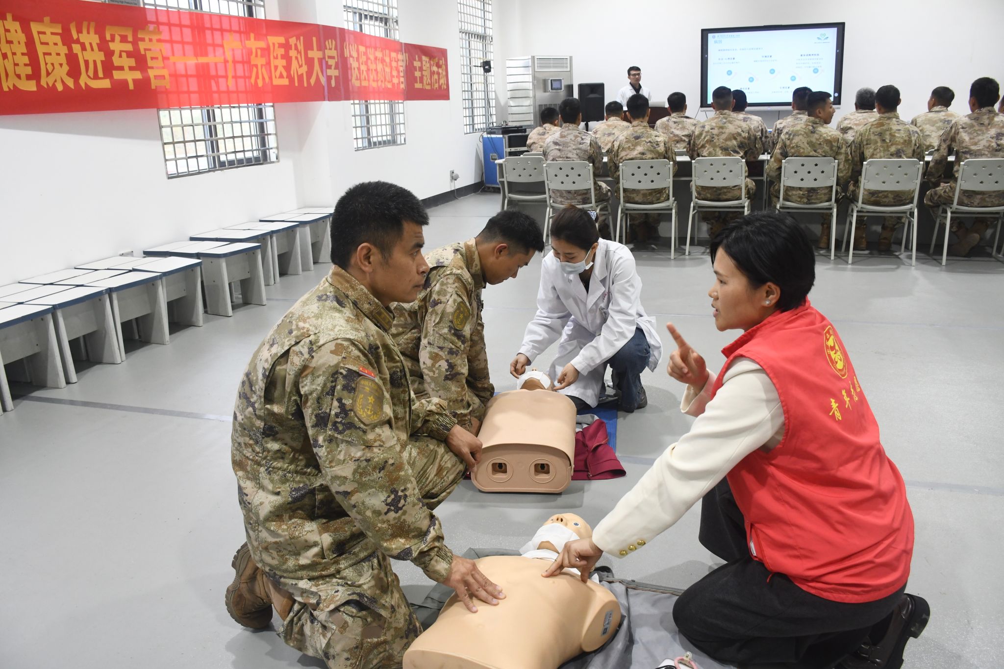活动现场分为健康宣教与专家坐诊两大板块。在健康宣教区,医护志愿者为官兵发放健康知识手册,并讲解常见训练伤病防治、中医保健等实用知识。急救技能培训环节中,医护人员通过模拟演示并指导心肺复苏实操演练,帮助官兵掌握基本急救操作方法,提升应急救护能力。专家义诊区则汇聚了来自广东医科大学附属第二医院多个科室的资深专家,涵盖骨科、神经内科、运动损伤科、康复医学科等领域,为官兵提供面对面的健康咨询、体格检查和用药指导。