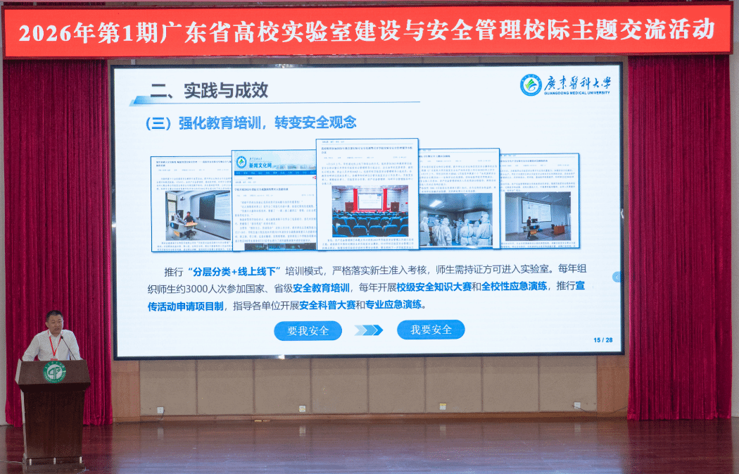 此次校际交流活动采用“专题报告+实地观摩”的形式,既搭建了全省高校实验室建设与安全管理交流学习的高效平台,也充分展示了广东医科大学在实验室建设、安全管理及学科发展方面的特色优势,进一步提升了学校的行业影响力与知名度,为后续校际合作搭建了坚实桥梁。下一步,广东医科大学将以此次交流为契机,持续加强开放交流,不断优化实验室管理模式、提升建设水平,深化校际协同协作,积极分享实践经验,助力广东省高校实验室建设与安全管理高质量发展,为医学教育提质、生物医药创新及健康广东建设提供有力保障。(文/陈芳芳 徐美奕 图/王丽君 审核/王珠乾 复审/周圆 审发/杨海云)