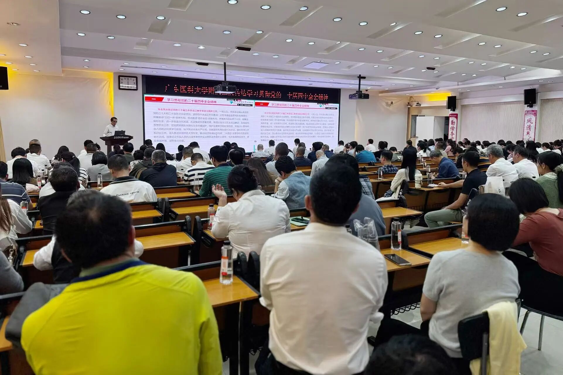 10月28日,广东医科大学附属医院召开干部大会,认真学习贯彻习近平总书记在党的二十届四中全会上的重要讲话精神和全会精神,传达学习全省和全市传达学习贯彻党的二十届四中全会精神干部大会精神。10月30日上午,广东医科大学附属医院分别召开党委会、党委理论学习中心组学习会议专题传达学习党的二十届四中全会精神。医院党委书记蔡定彬主持并讲话。