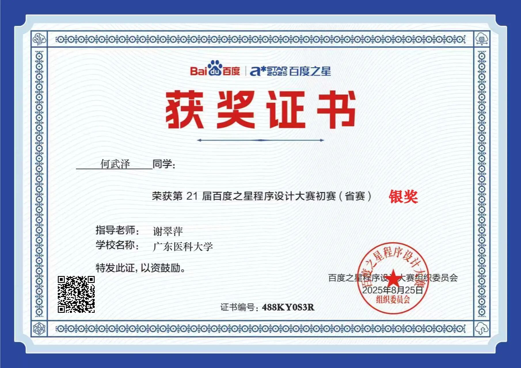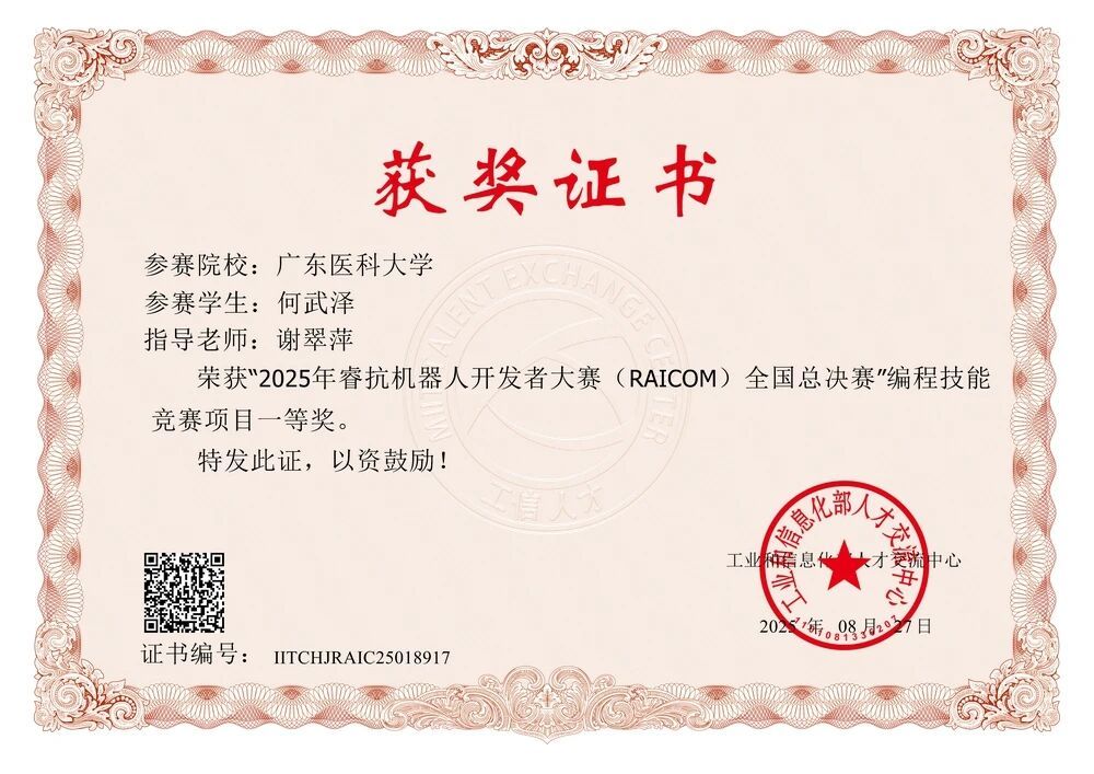 在教育部观察名单赛事及省级竞赛中,荣获2024-2025年度全国大学生计算机应用数字素养大赛(暨第七届传智杯程序设计挑战赛)全国总决赛一等奖、第六届全国高校计算能力挑战赛Java组华南赛区一等奖、第一届CCF算法能力大赛广东省二等奖、第三届大学生算法大赛全国总决赛一等奖、第四届广东医科大学ACM程序设计大赛一等奖收入囊中,成为跨赛道、多领域的“获奖常客”。