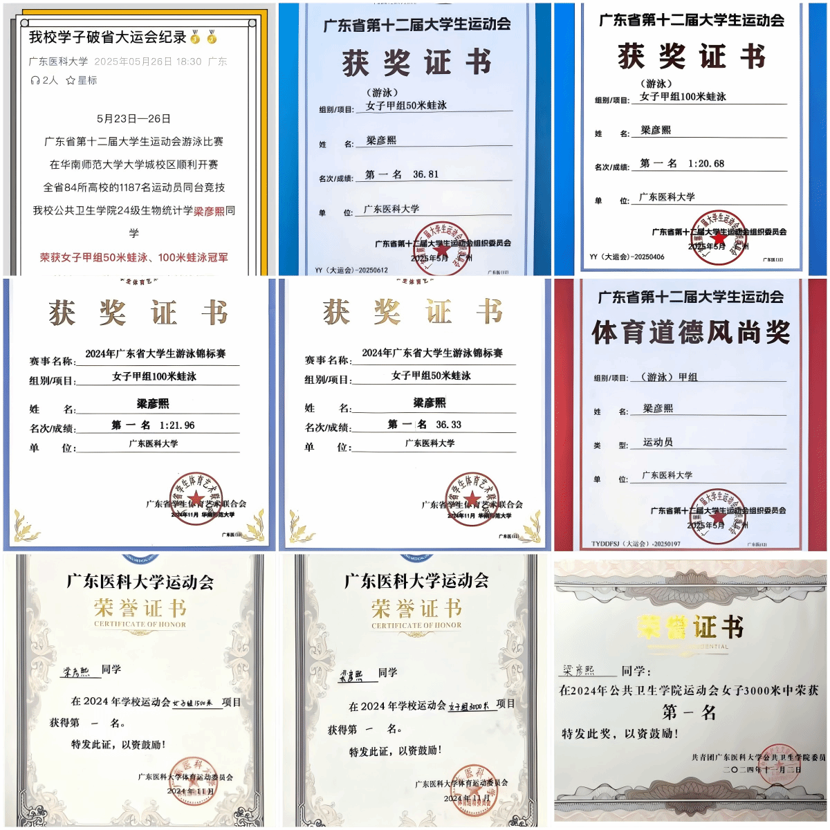 自幼与游泳结缘,寒来暑往坚持训练。在广东省第十二届大学生运动会中,一举夺得女子甲组 50 米、100 米蛙泳双冠军,100 米蛙泳打破赛事纪录;连续包揽 2024、2025 年广东省大学生游泳锦标赛相关项目冠军,同时斩获体育道德风尚奖,在校园运动会长跑项目中亦多次夺冠,用拼搏诠释体育精神。
