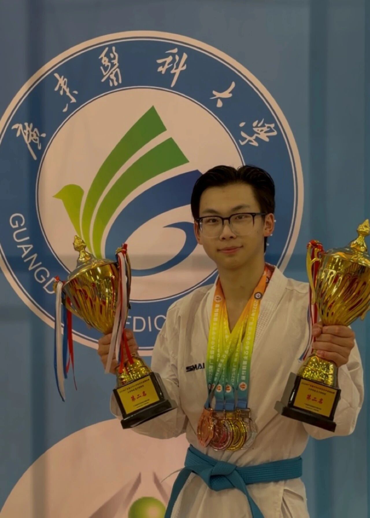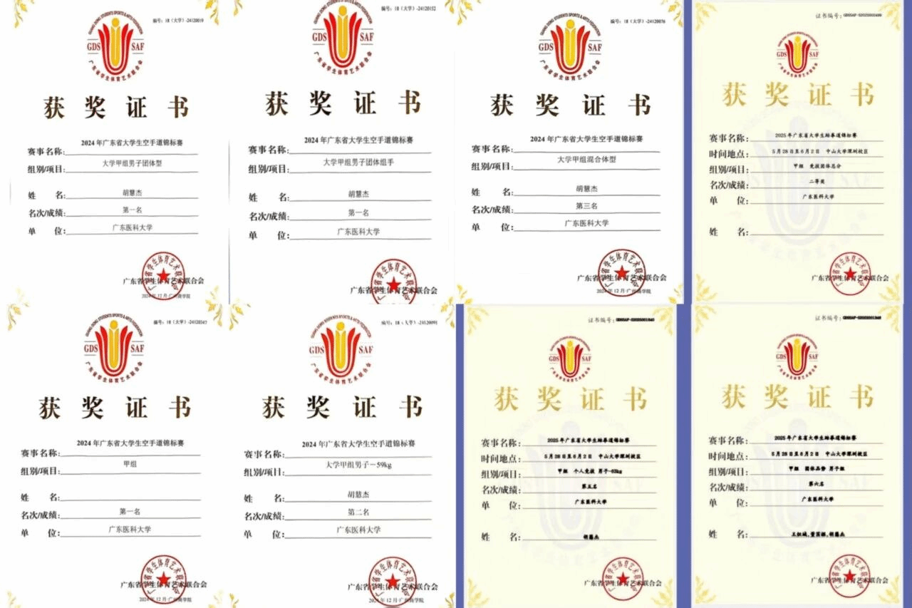 胡慧杰始终以“体育强国”为己任,多次代表学校征战国家级重大赛事,屡创佳绩。作为校空手道队队长,他累计组织训练超600小时,个人斩获国家级奖项10项、省级奖项30项,刷新学校在省级体育赛事中金牌数与奖牌数的历史纪录,让广东医科大学的旗帜在赛场上高高飘扬。