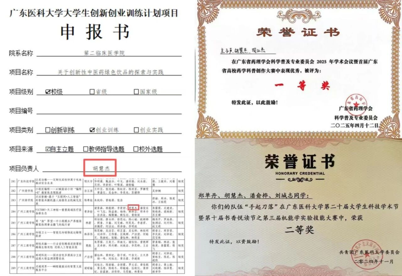 胡慧杰以卓越学业表现和科研追求,树立年级标杆。他连续三年取得综合一等奖学金,2024-2025学年综合测评位列专业第一(1/415),多门核心课程位居专业第一。他注重临床思维与创新能力培养,主持的中医药饮品研发项目获校级创新创业立项并入驻孵化中心;在广东省高校药学科普创作大赛中荣获一等奖。他连续两年参与中国国际大学生创新大赛,荣获广东省赛区铜奖,原创视频在十八届广东大学生校园文体艺术季活动荣获省三等奖,展现出扎实的科研素养与创新潜力。